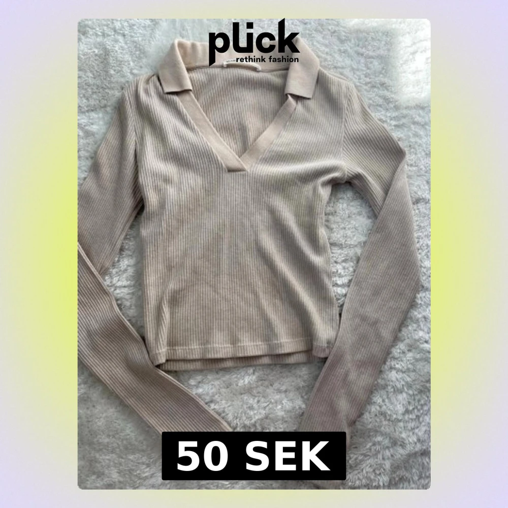 Säljer en beige ribbad långärmad topp från Pull&Bear med v-ringning och krage. Perfekt för dig som gillar en enkel men snygg stil. Materialet är mjukt och stretchigt, vilket gör den bekväm att bära hela dagen. Finns en väldigt liten fläck på baksidan som knappt syns. Inte testat att ta bort.