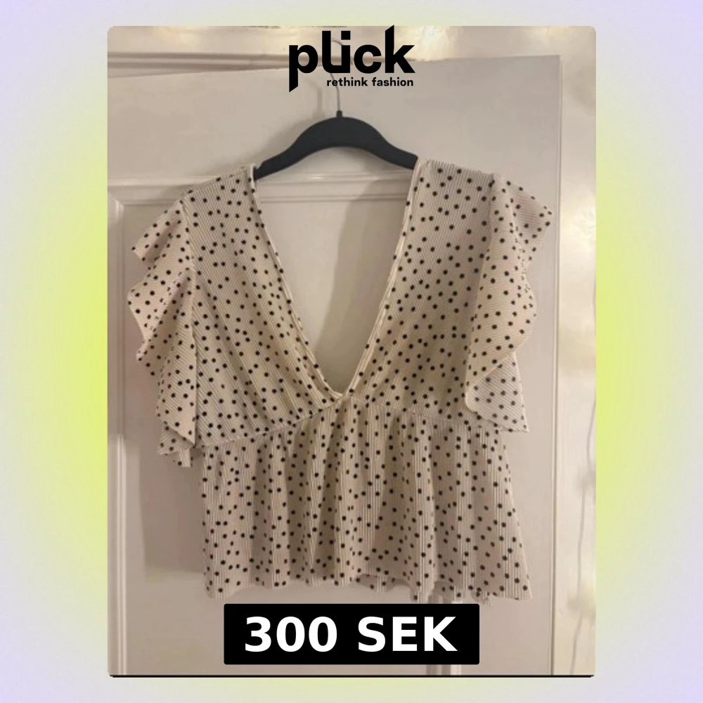 Supersöt blus i vitt med svarta prickar och volangärmar. Djup v-ringning både fram och bak, croppad modell med luftig passform. Perfet och trendig topp till sommaren.