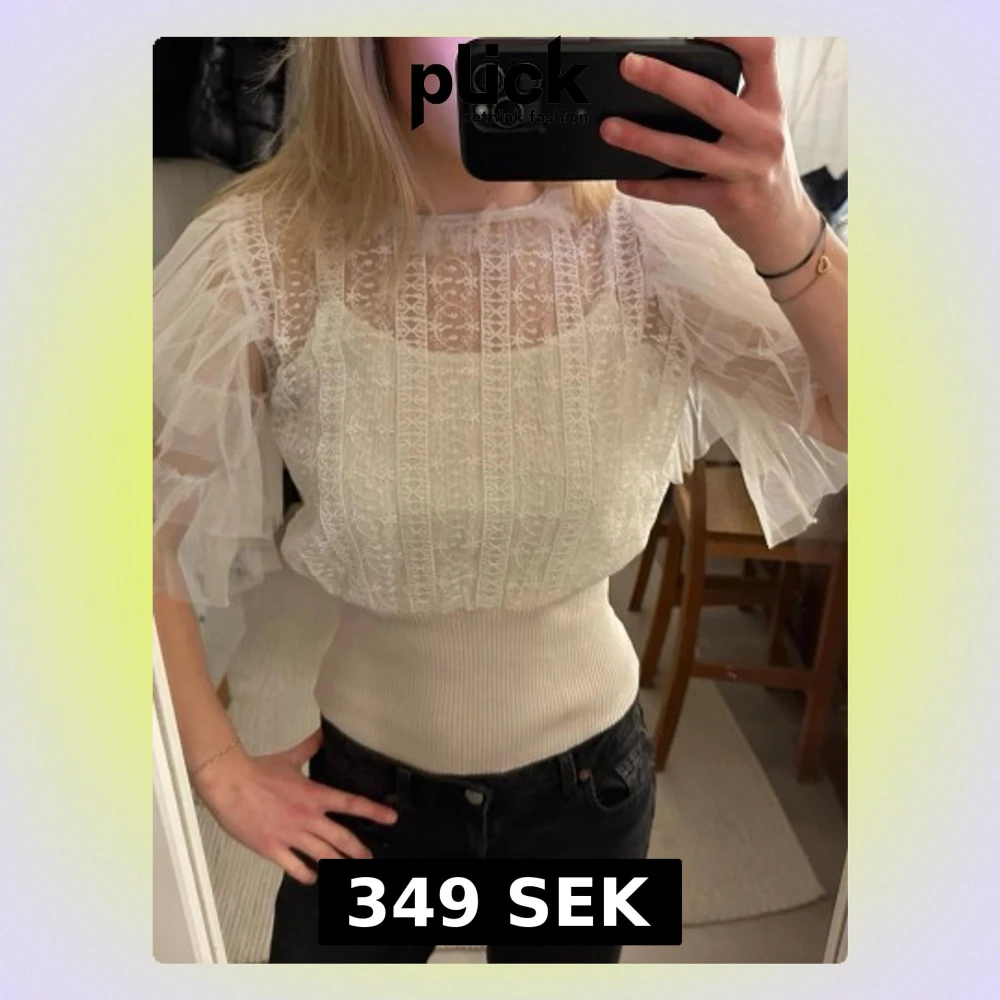 Supersöt vit blus med transparent spets upptill och bred ribbad midja. Puffiga volangärmar i tunn mesh ger en riktigt drömmig look. Perfekt till jeans eller kjol när du vill känna dig extra fin, köpt i Spanien så unik✨. Ingen synlig logga men känns exklusiv och trendig. Använd fåtal gånger!