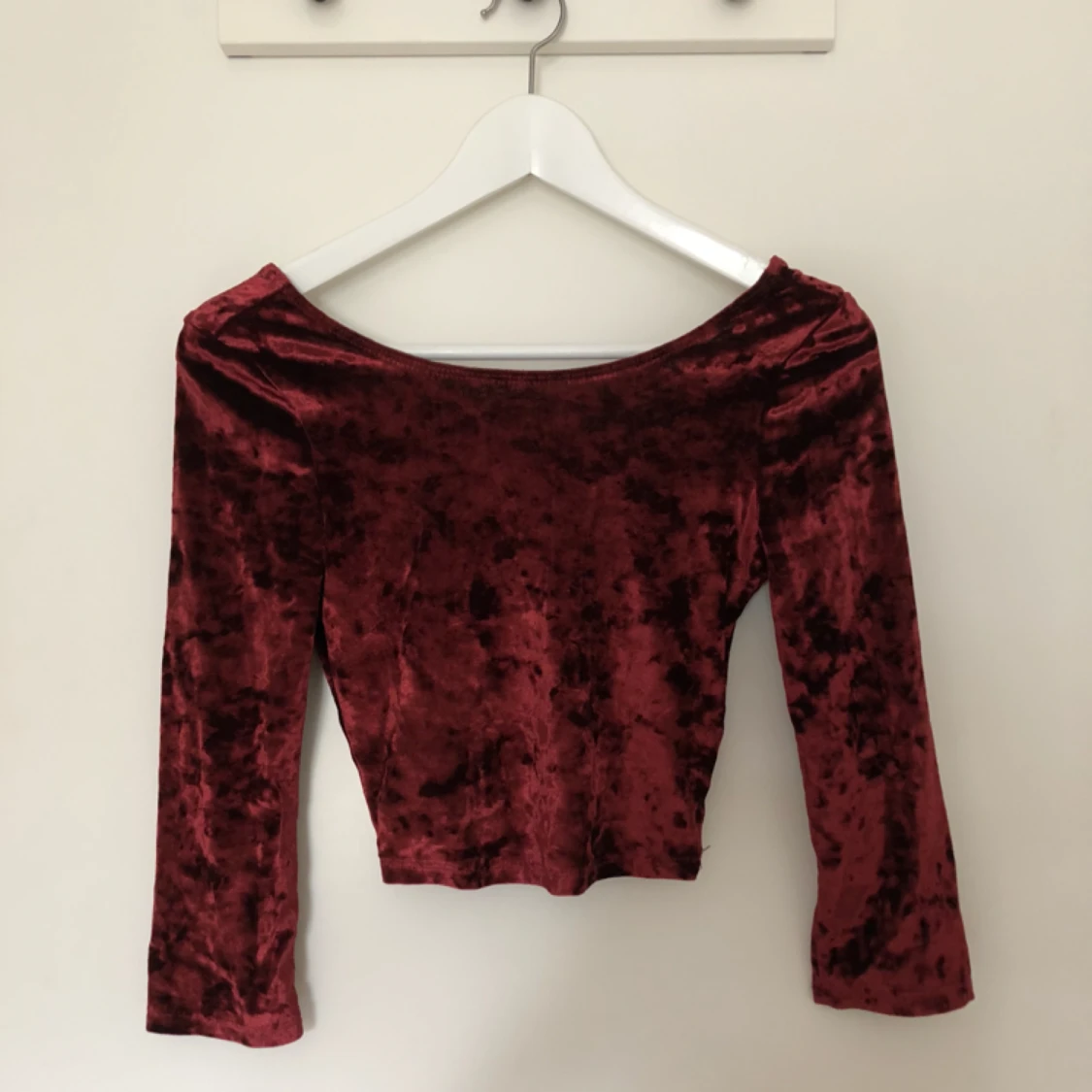 säljer en höstig röd sammetscroptop från pull&bear i storlek XS! frakt tillkommer
