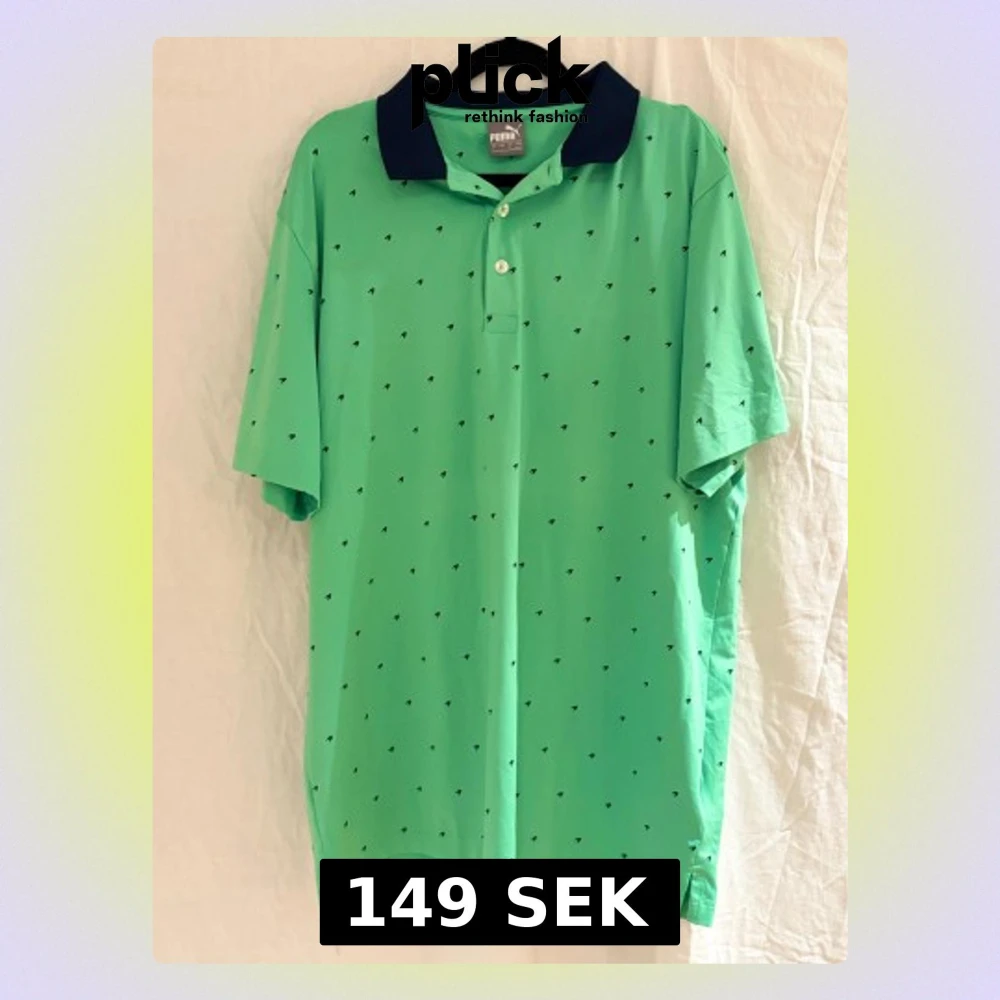 Snygg grön pikétröja från Puma med mörkblå krage och små svarta mönster över hela tröjan. Tröjan har korta ärmar, knappar framtill och Puma-logga på ärmen. Perfekt för en sportig och avslappnad stil.