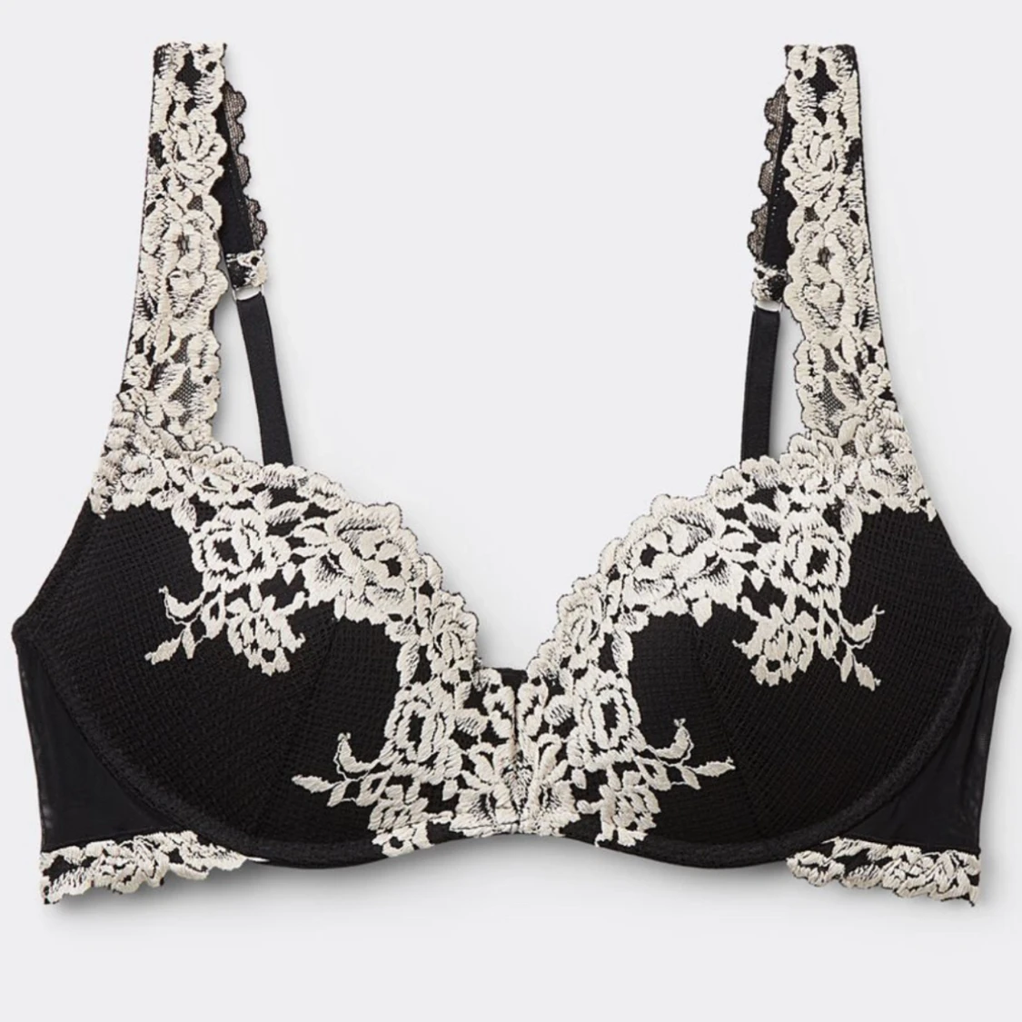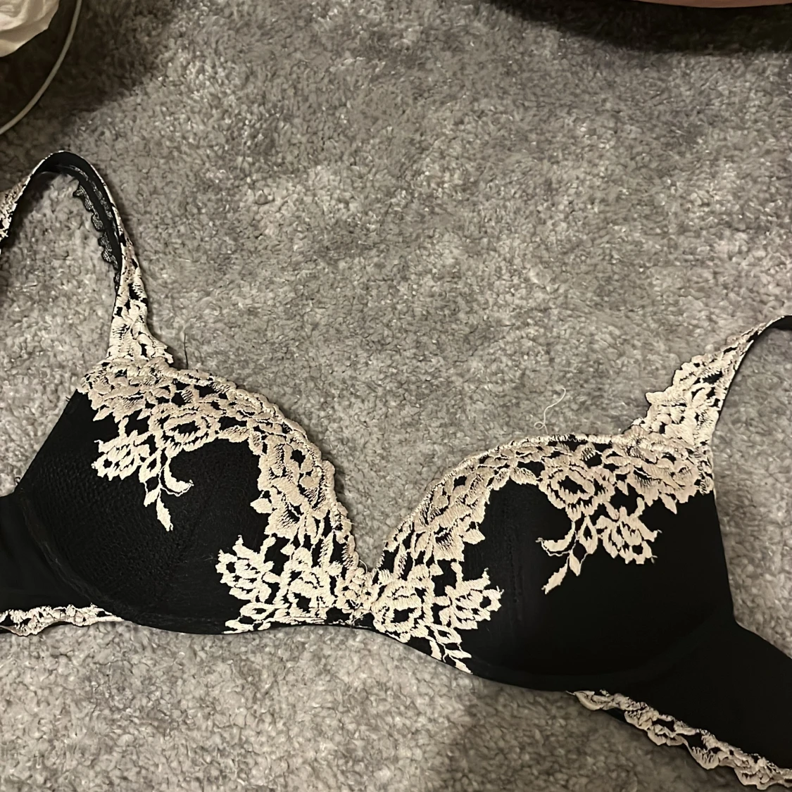STORLEK 80b 💗💗💗Elegant svart behå med vackra vita spetsbroderier. Den har justerbara axelband och en klassisk design som ger bra stöd. Perfekt för att känna sig extra fin under kläderna.