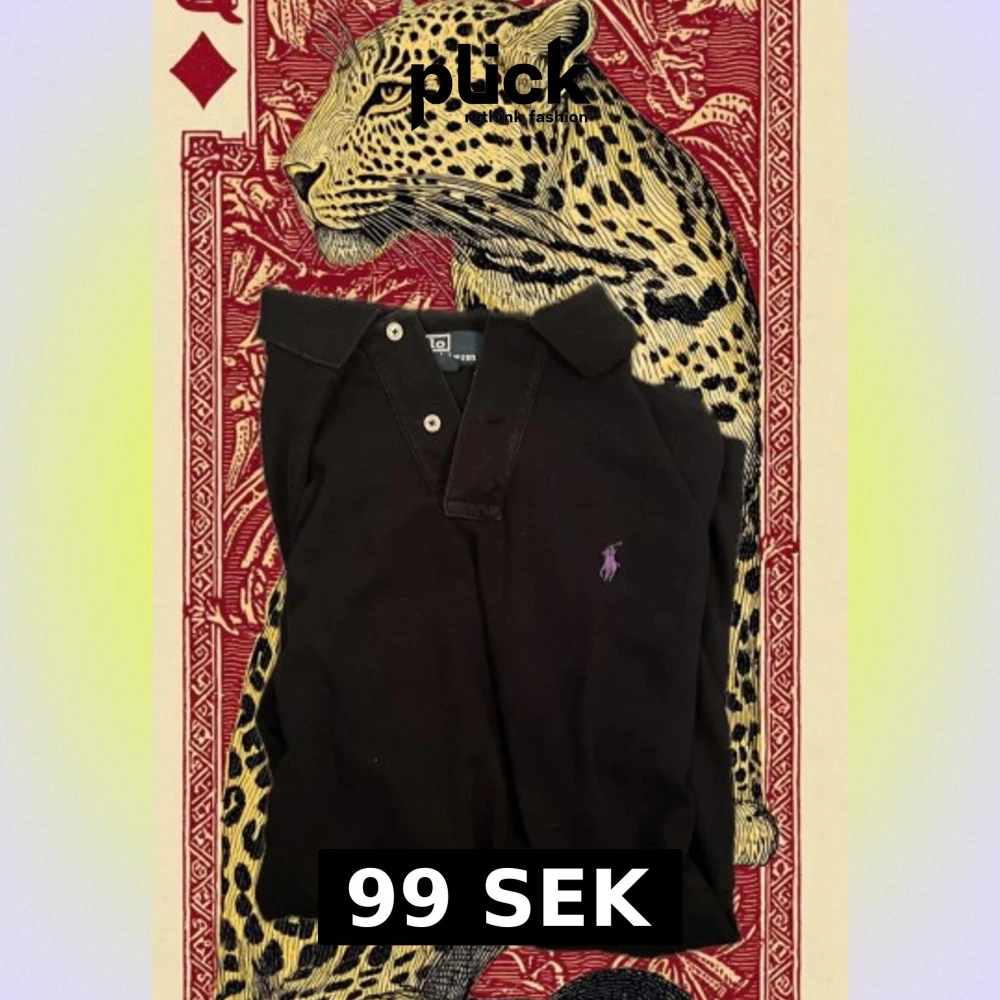 Svart pikétröja från Polo Ralph Lauren i storlek M. Klassisk krage, två knappar framtill och lila broderad logga på bröstet. Kortärmad och tillverkad i mjuk bomull som är skön mot huden. Perfekt för en clean och stilren look.