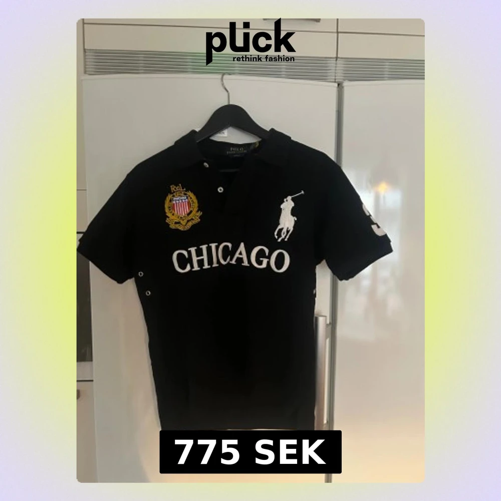 Svart polotopp från Polo Ralph Lauren med vit CHICAGO-text och broderad logga på bröstet. Slim fit-modell med korta ärmar och stora vita siffror '3' på ryggen och ena ärmen. Helt oanvänd och inga fläckar eller slitningar. Toppens material är mjuk bomull och har klassisk krage med knappar.
