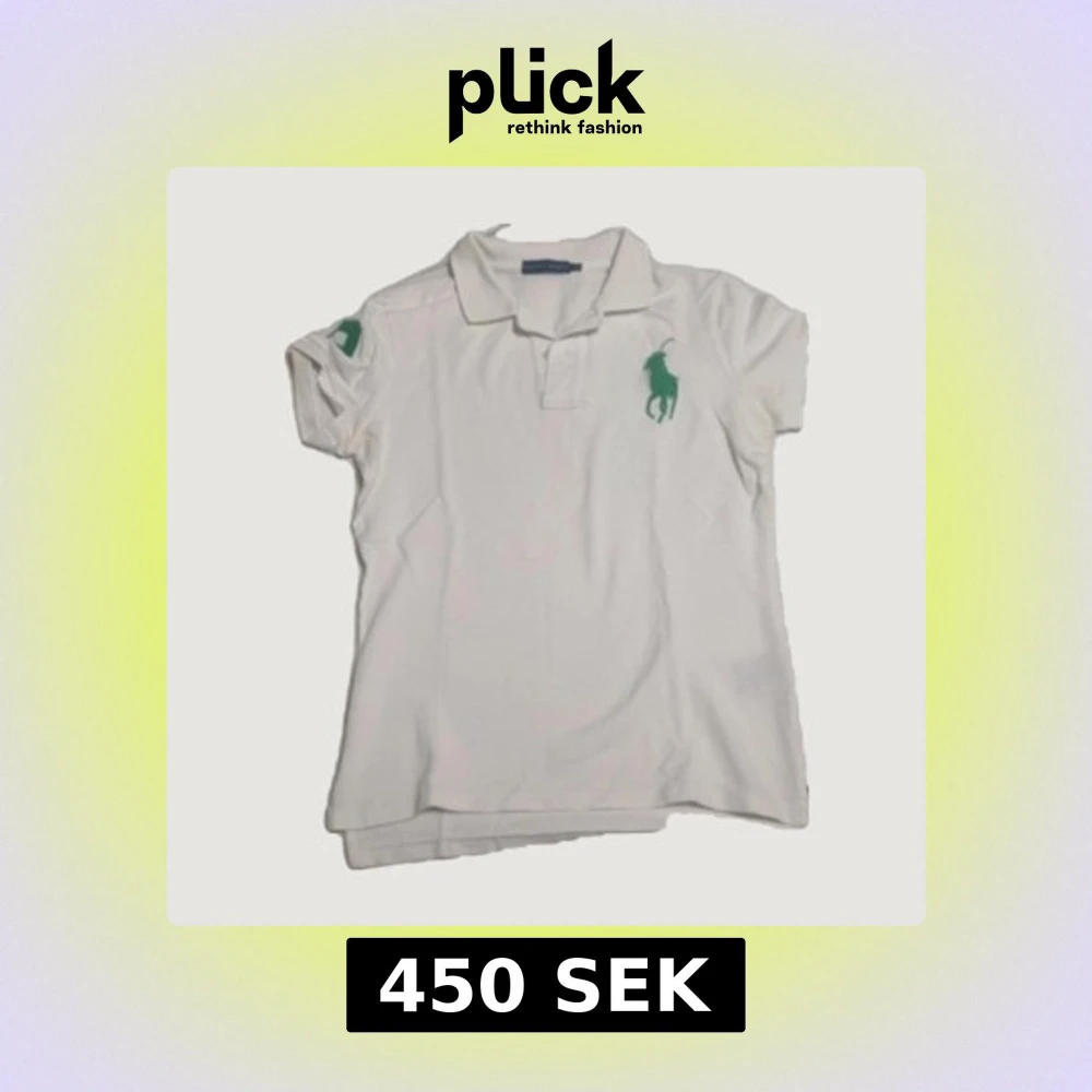 Vit pikétröja från Ralph Lauren med klassisk krage och korta ärmar. Stort grönt broderat logomärke på bröstet och siffra på ärmen. Perfekt för en sportig och stilren look.