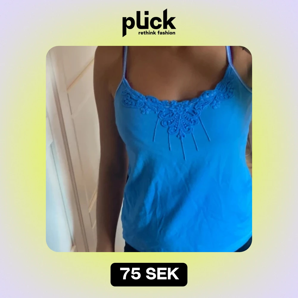 Säljer en superfin blå linnetopp med smala axelband och vacker spetsdetalj vid halsringningen. Perfekt för sommaren eller en festlig kväll. Toppen är i bra skick och väldigt bekväm att ha på sig. Passar perfekt till både jeans och kjol!