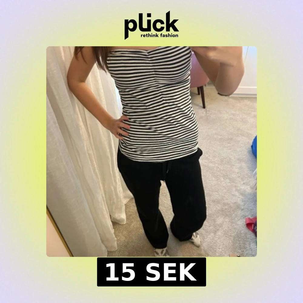 Säljer en snygg bandeau tubtopp med svartvita ränder. Toppen är axelbandslös och har en tight passform som sitter skönt mot kroppen. Materialet är mjuk bomull och toppen har en lätt rynkning framtill för extra stil. Perfekt för dig som gillar enkel och fräsch look.