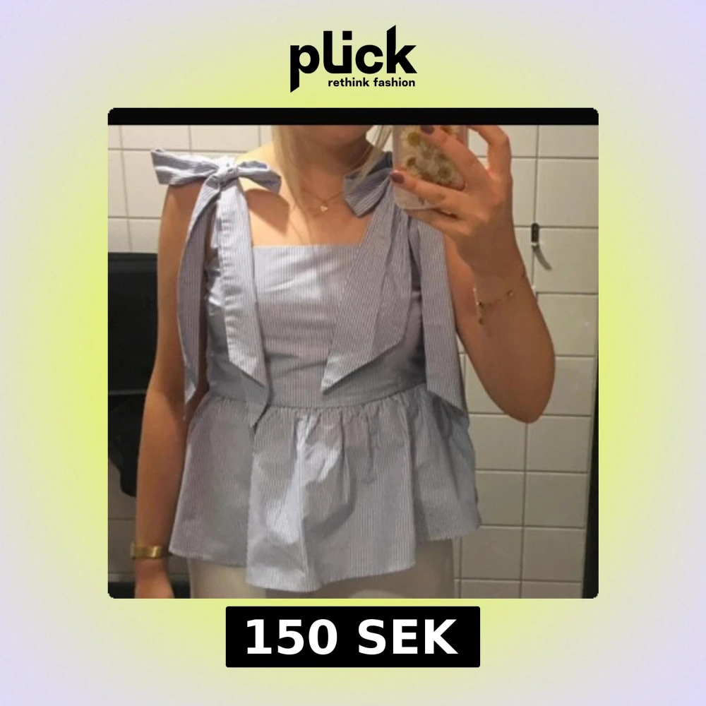 Supersöt blå- och vitrandig linnetopp från H&M Storlek M/38. med breda axelband som knyts i stora rosetter. Toppen har volang nertill och dragkedja i sidan för enkel påklädning. Priset går att diskutera 💕💕💕