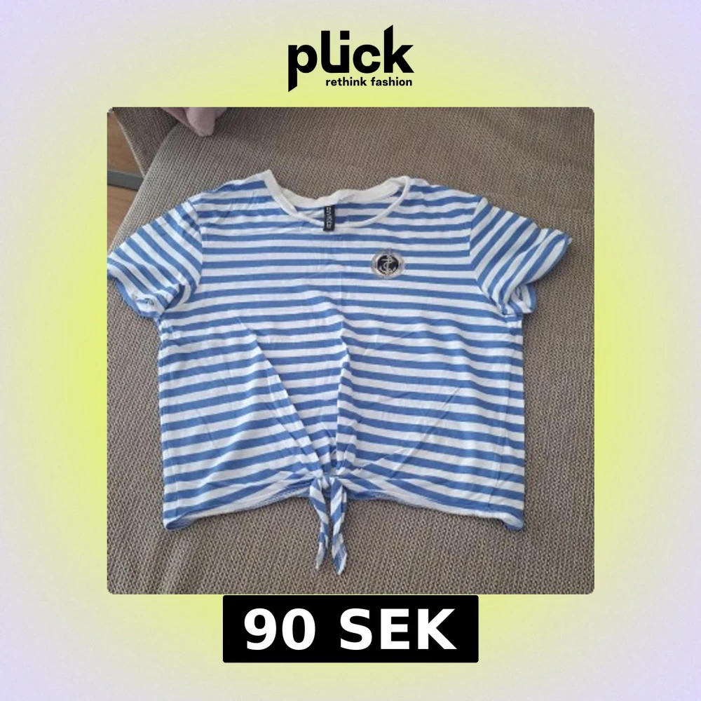 Superfin blåvit randig topp från Cropp med korta ärmar och knytning framtill. T-shirten har ett marin-inspirerat märke med ankare på bröstet och är perfekt för en chill sommarlook.