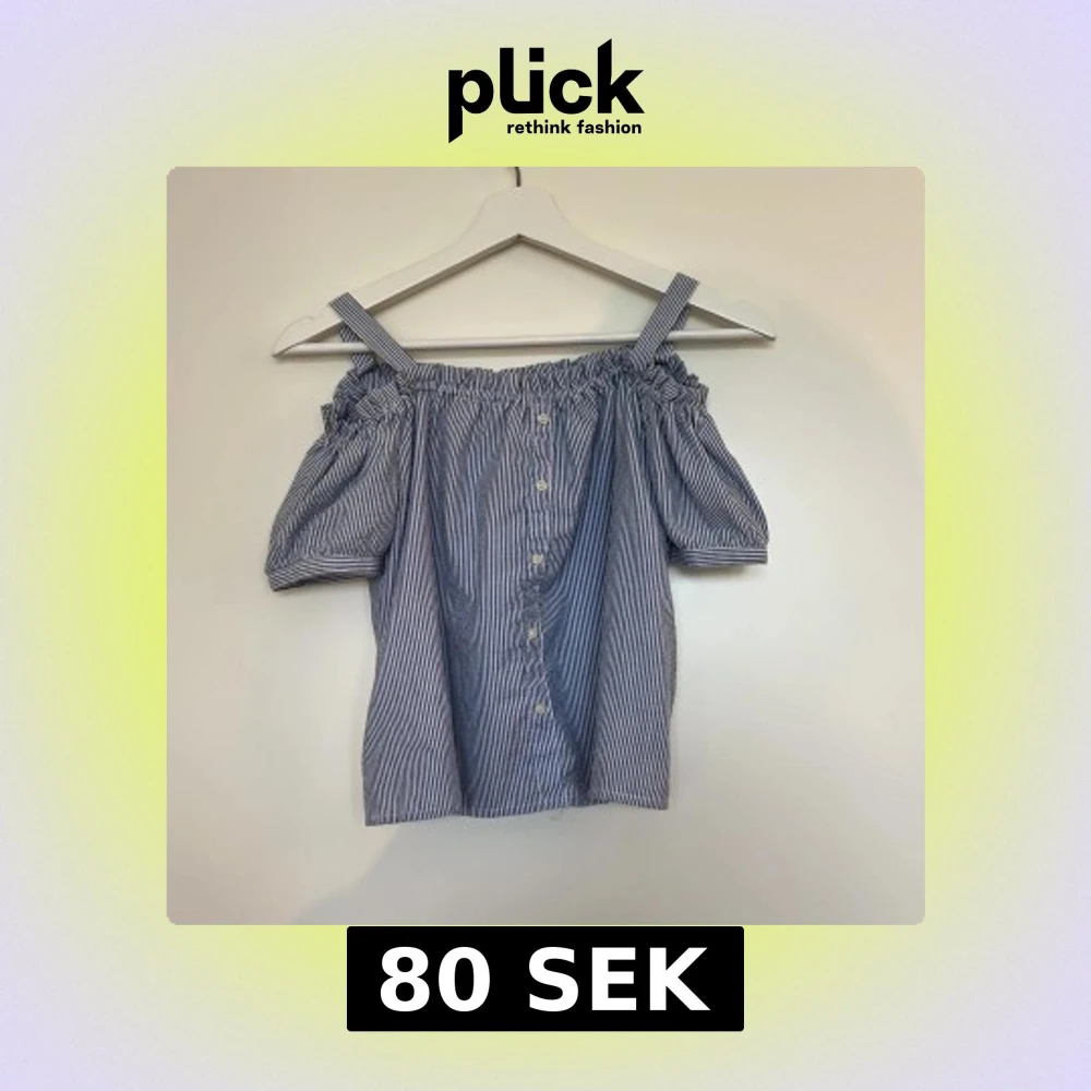 Säljer en blåvit randig blus från Springfield i storlek 36. Blusen har offshoulder-modell med puffiga korta ärmar, knappar framtill och smala axelband. Har sytt upp axelbanden men går lätt att sprätta för att få längre band.