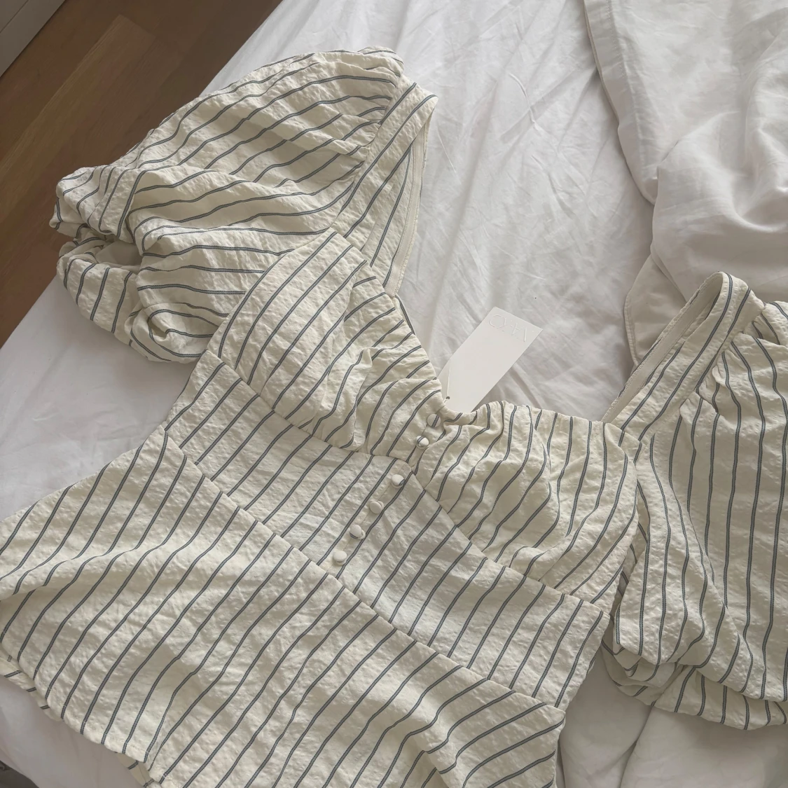Superfin blus i ljusbeige med svarta ränder, puffiga korta ärmar och söt knytrosett i ryggen. Toppen har markerad midja, knappar framtill och fyrkantig ringning. Perfekt för dig som gillar romantisk och trendig stil. Passar till s-m🩷