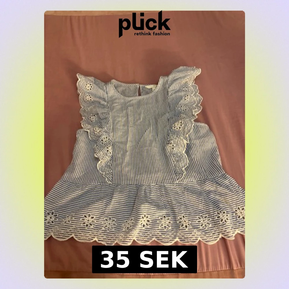 Supersöt blus från H&M i storlek S med blåvita ränder och detaljerad vit spets längs volangärmar och nederkant. Blusen har en rund hals och är ärmlös, perfekt för en fräsch och somrig look. Materialet känns lätt och luftigt.
