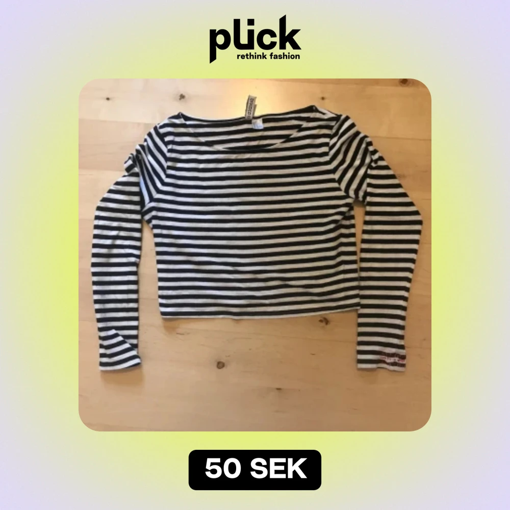 Randig långärmad crop top från H&M. Strl M men funkar imo också för mindre storlekar med en mer baggy passform. Lagning i sashikostil på ena ärmen, se bild 3. Najs att ha som lager under en större t-shirt.
