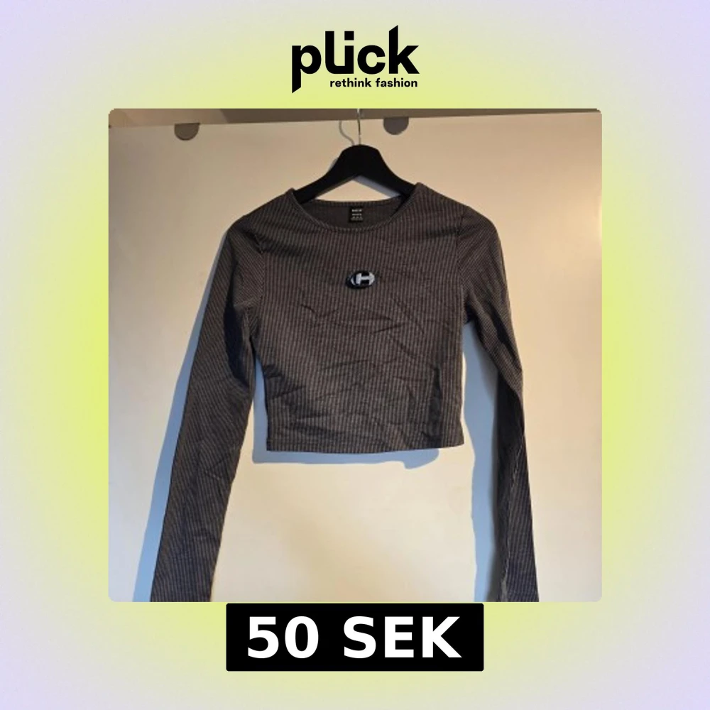 Säljer en croppad långärmad topp. Toppen är ribbad och har en liten broderad logga framtill. Perfekt för dig som gillar en enkel men snygg stil.