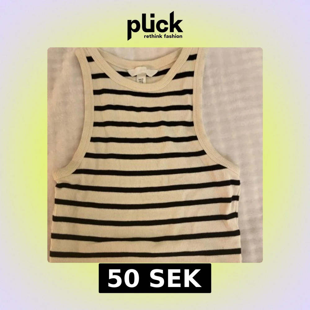 Säljer en fräsch croppad linnetopp från H&M i storlek XS. Toppen är vit med svarta horisontella ränder och har en ribbad struktur. Ärmlös design med rund halsringning, perfekt för dig som gillar en enkel men snygg look.
