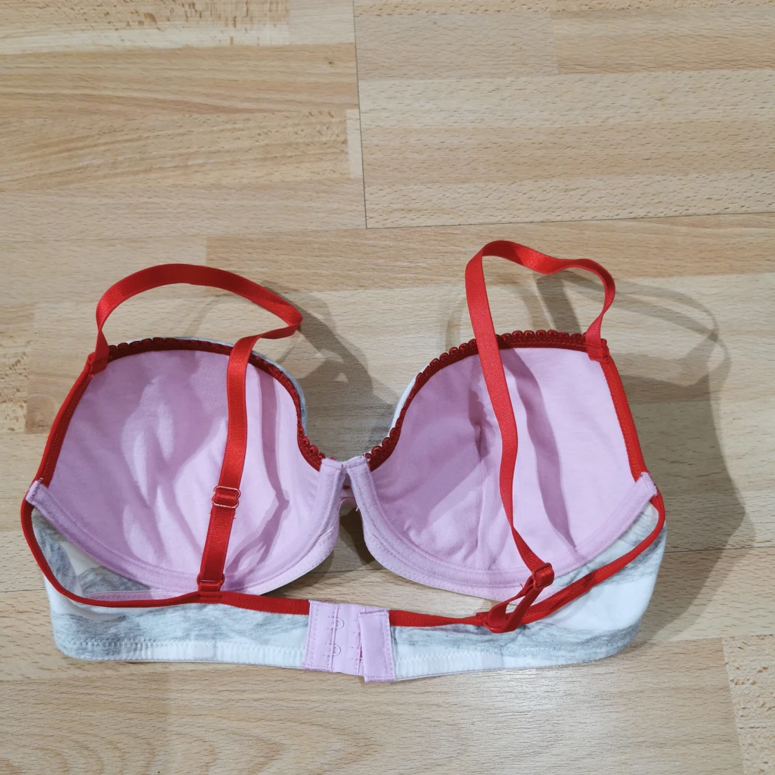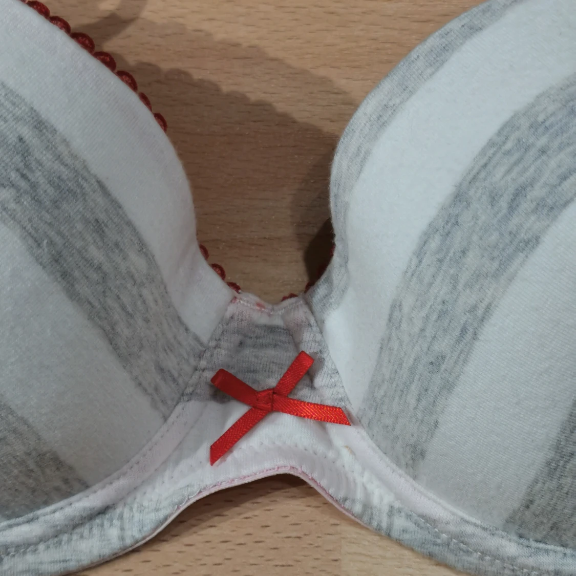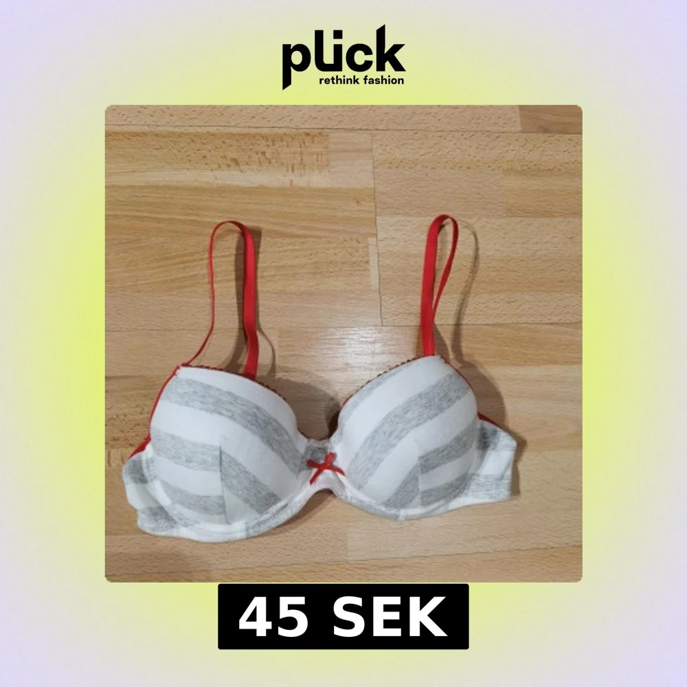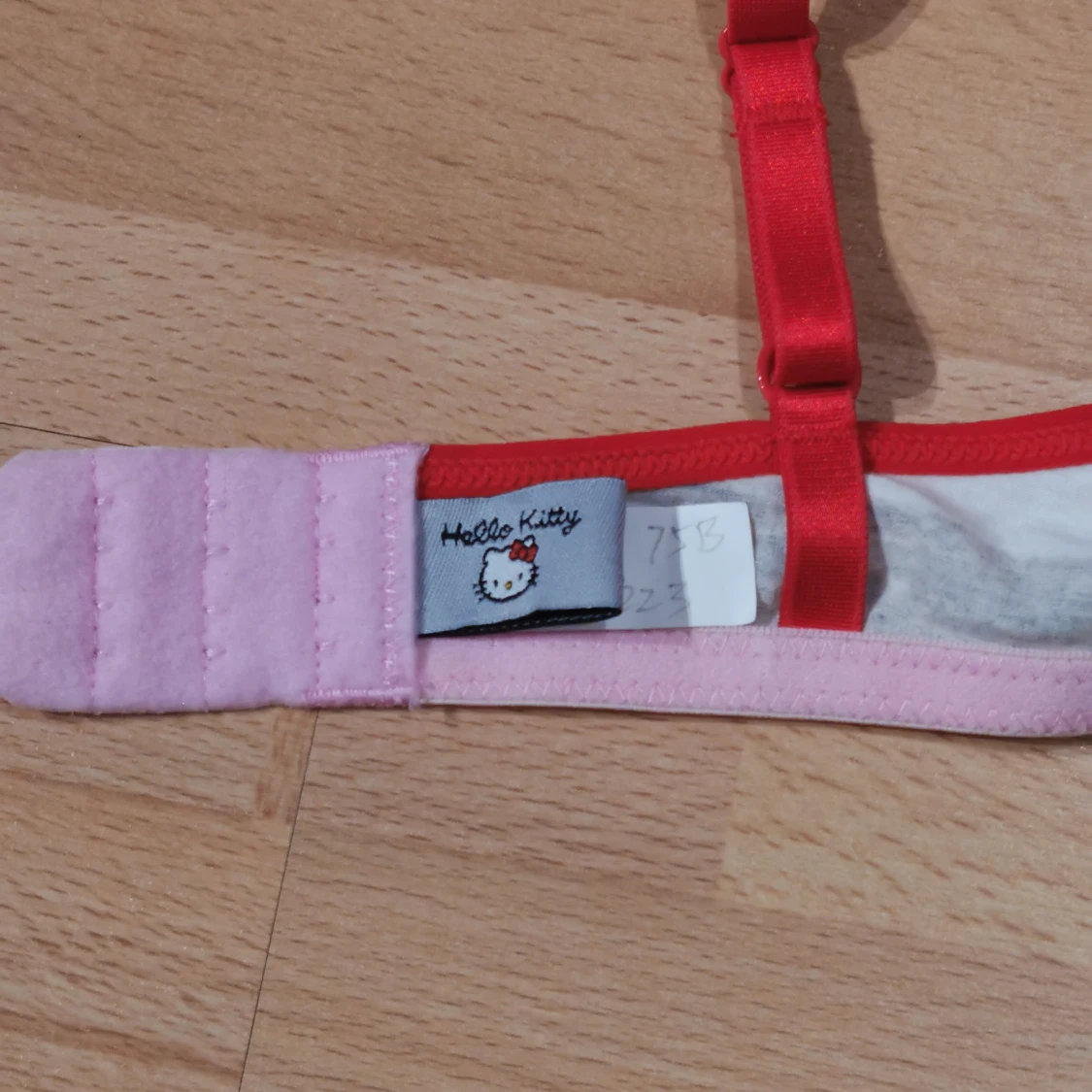 Söt linnetopp från Hello Kitty med grå och vita ränder, röda axelband och en liten röd rosett framtill. Insidan är ljusrosa och har justerbara band. Perfekt för dig som gillar gulliga detaljer och färgkombinationer.