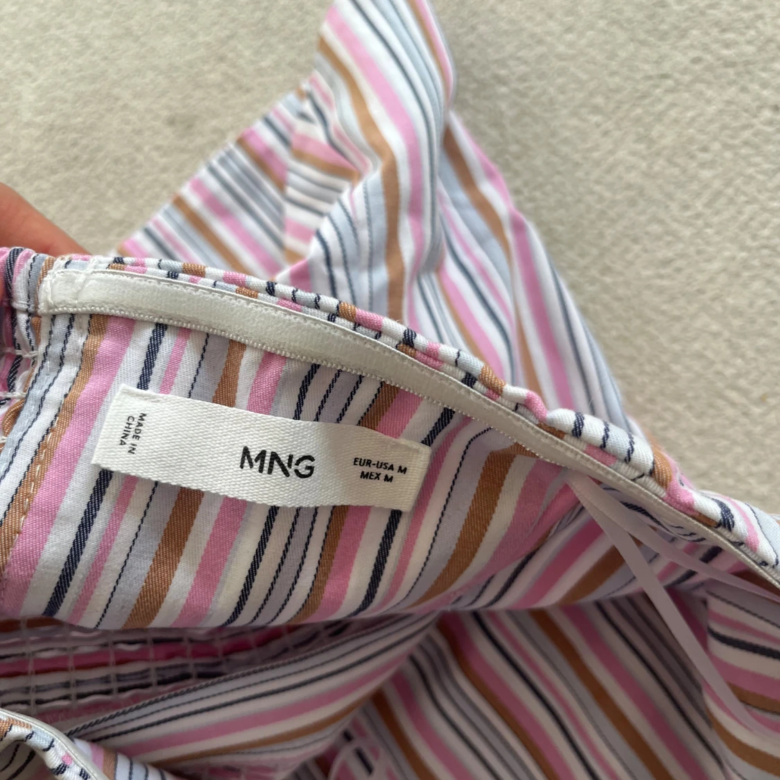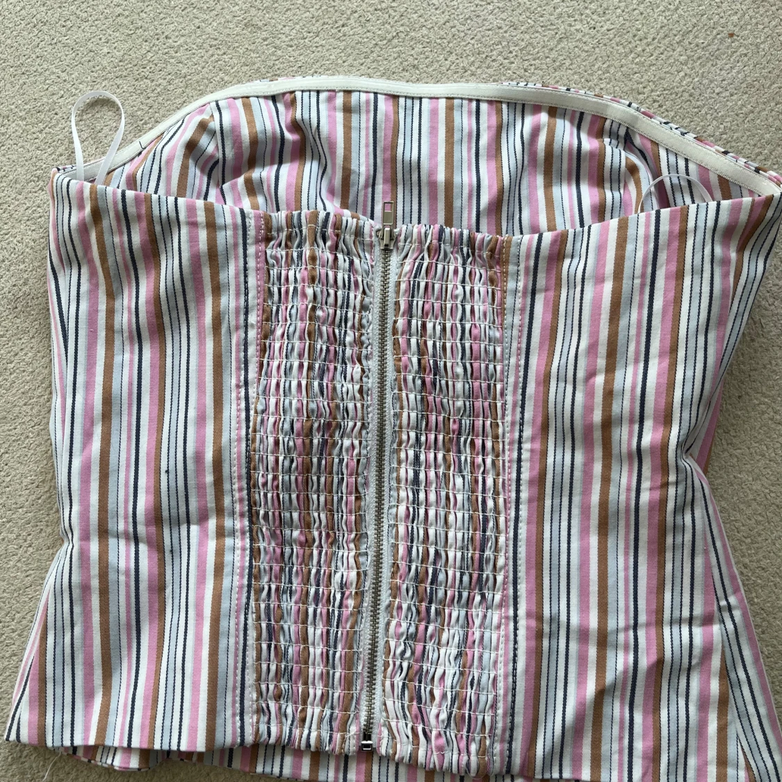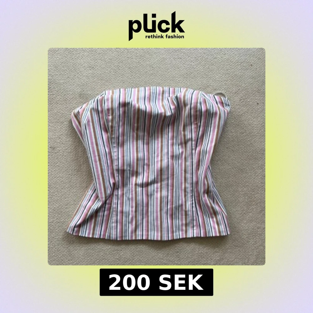 Säljer en snygg randig korsett från mango i storlek M. Toppen har ränder i rosa, beige, vitt och blå, med en smickrande form och dragkedja bak. Aldrig använd.