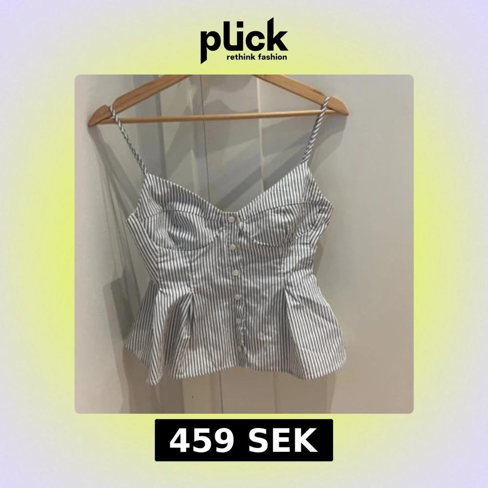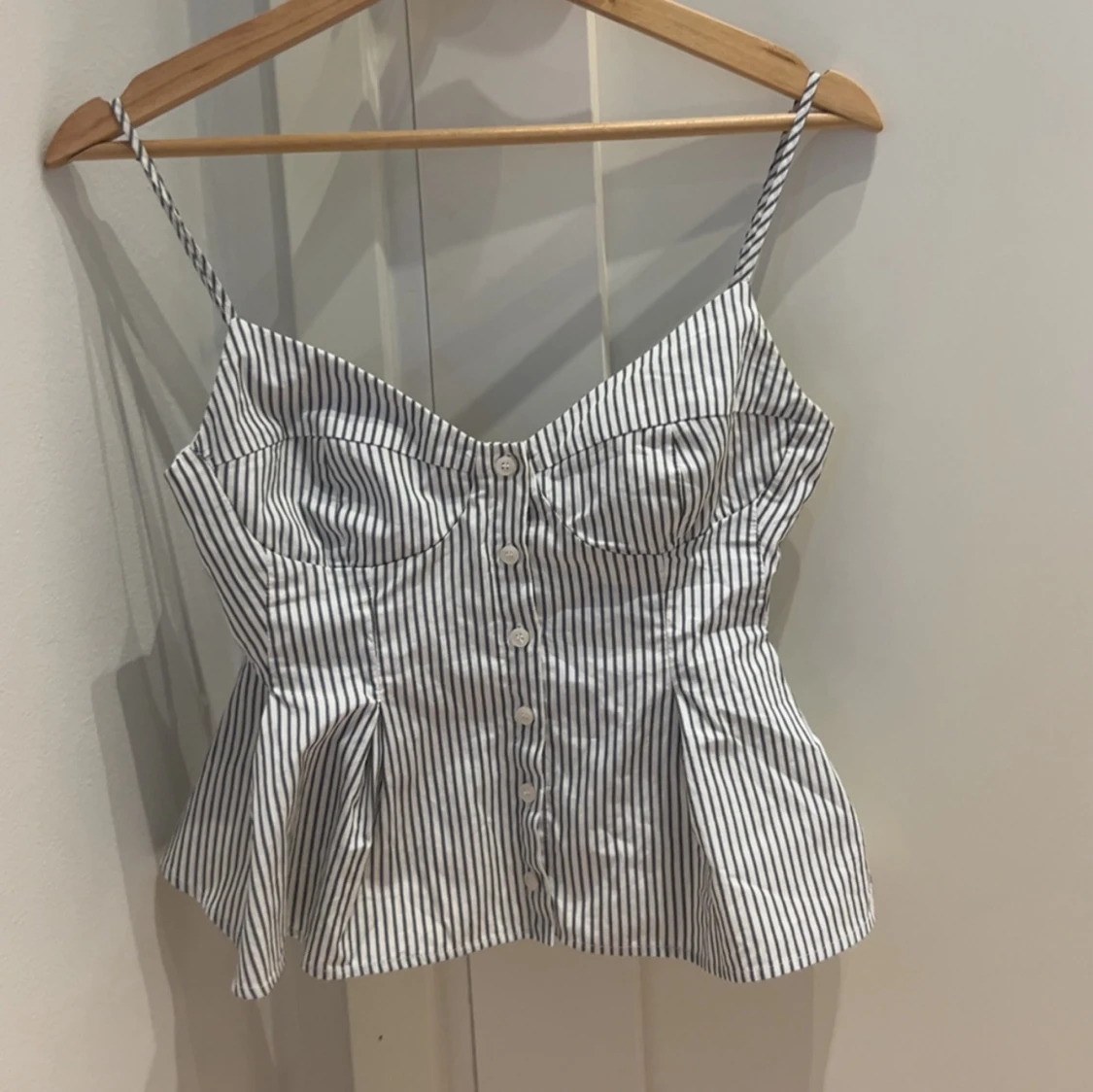 Säljer en eftertraktad snygg vit och svart randig korsett-topp från Zara i storlek S. Toppen har smala axelband, knappar framtill och en figurnära passform med utsvängd nederdel. Perfekt för dig som gillar trendiga detaljer och en feminin siluett.
