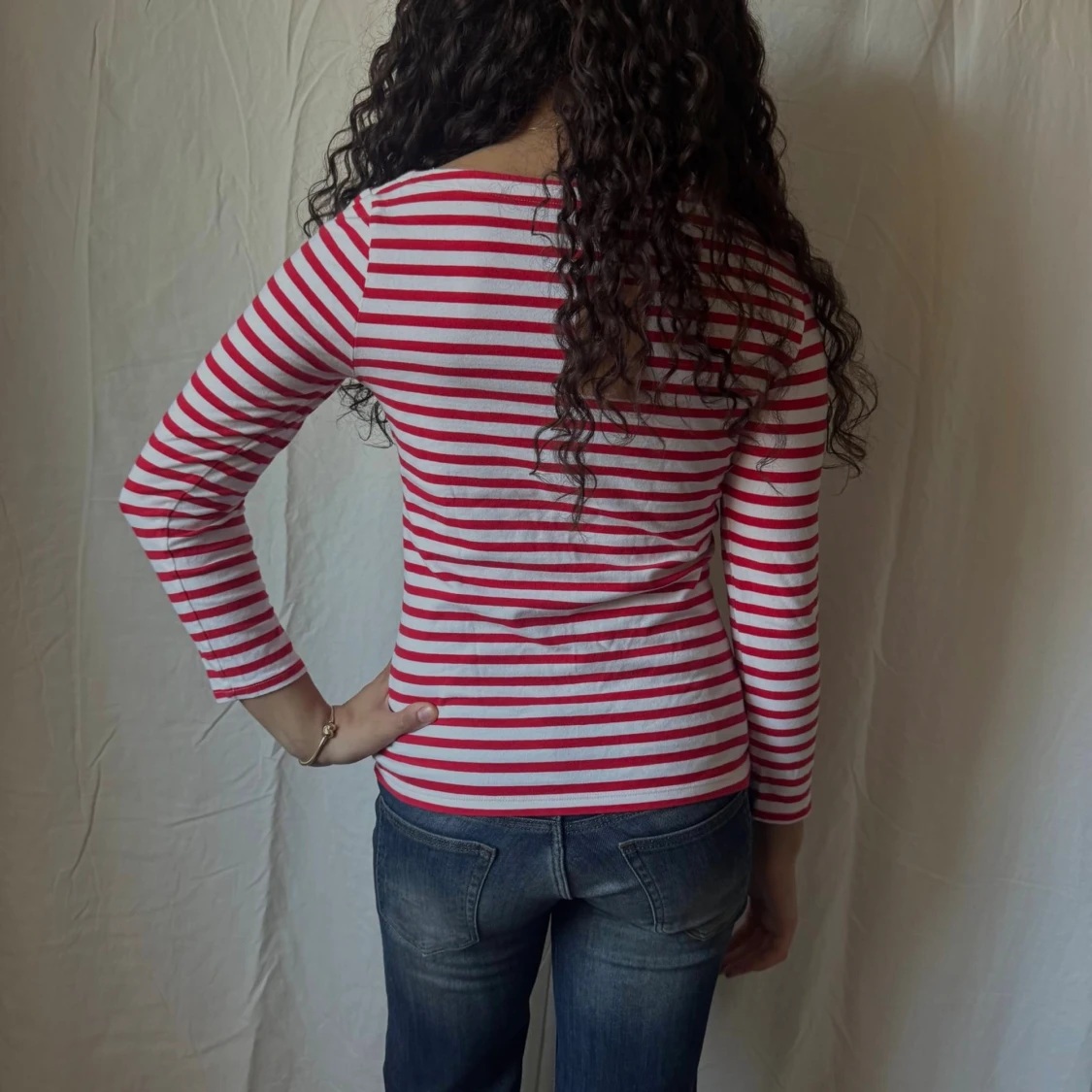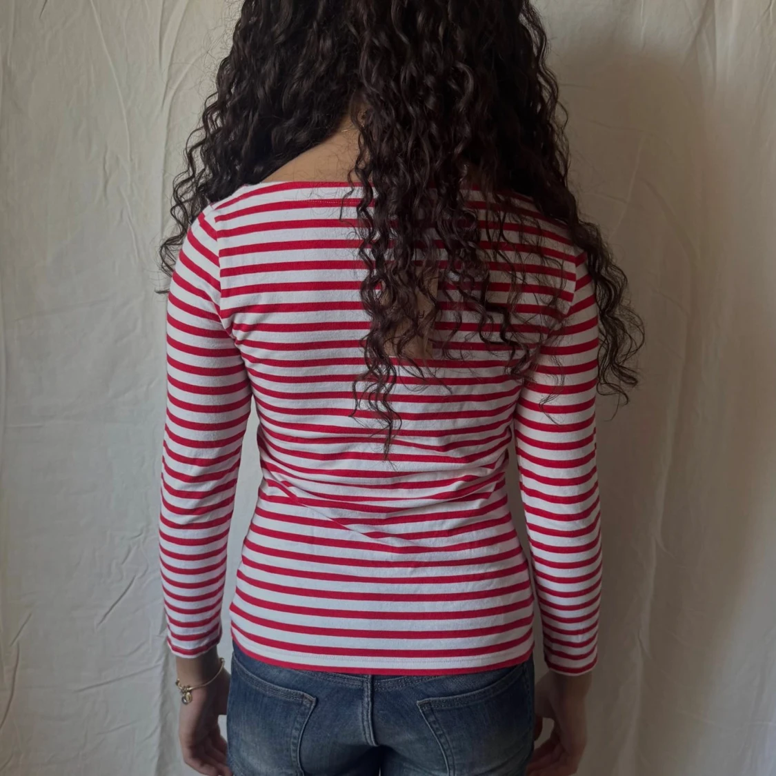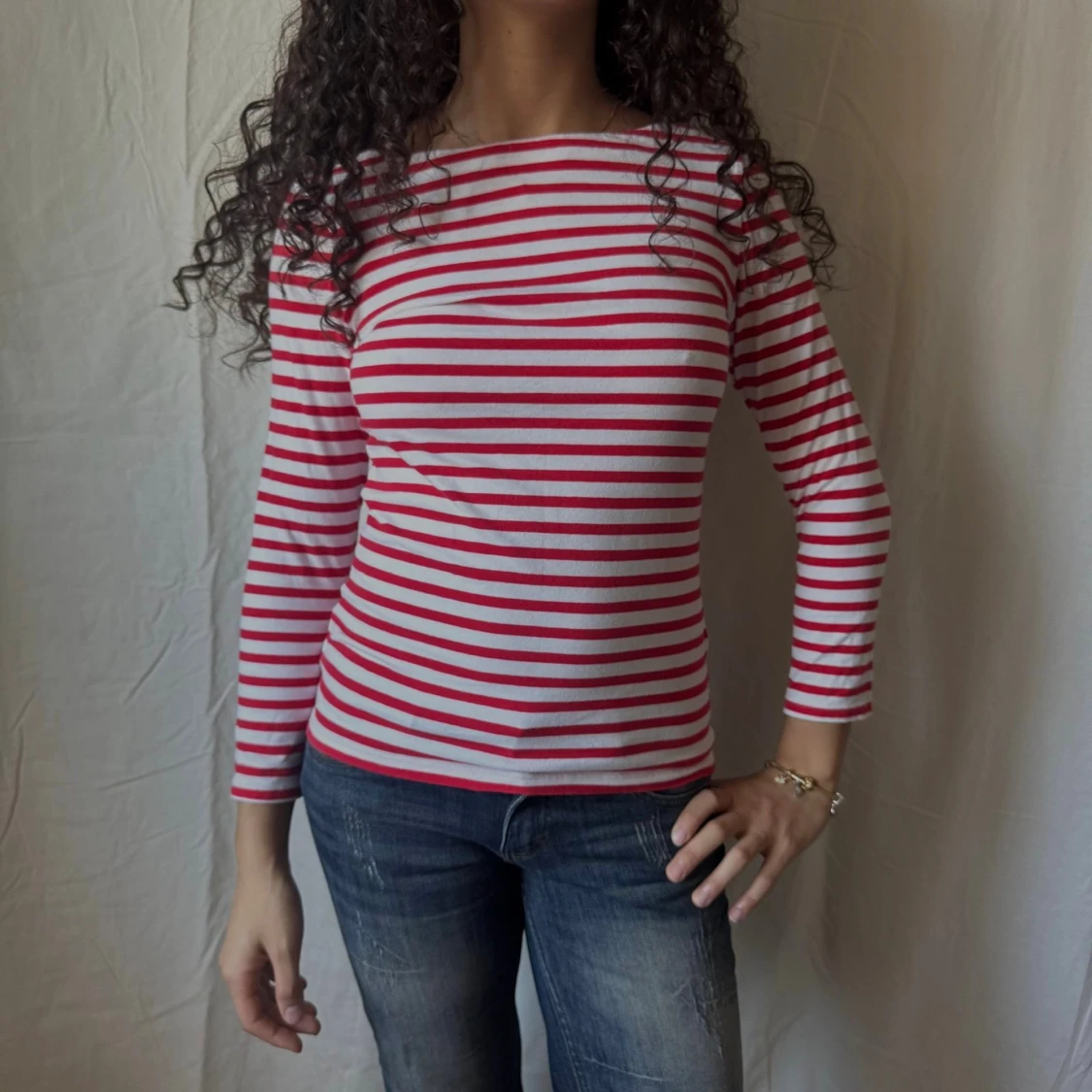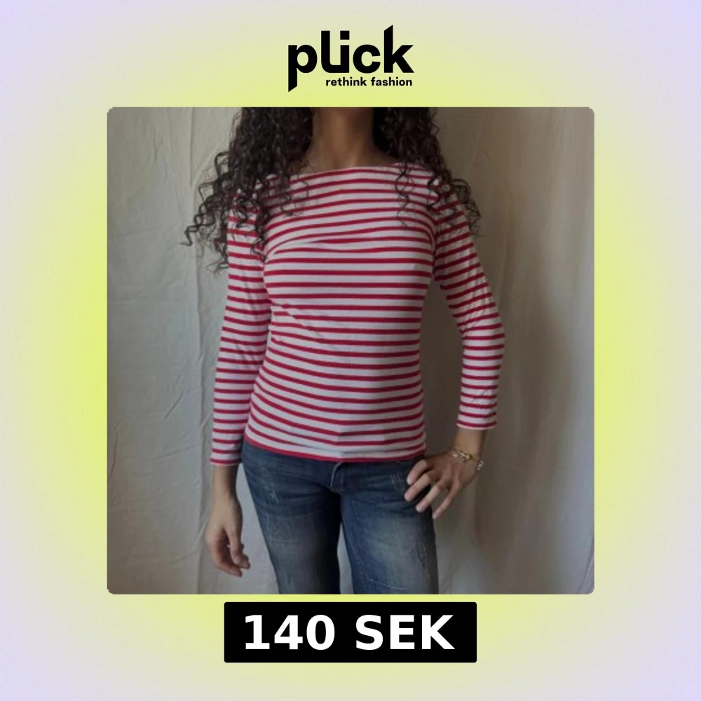 Långärmad topp med båtringning samt röda och vita ränder. Sitter figurnära. Perfekt för en snygg vardagsoutfit!