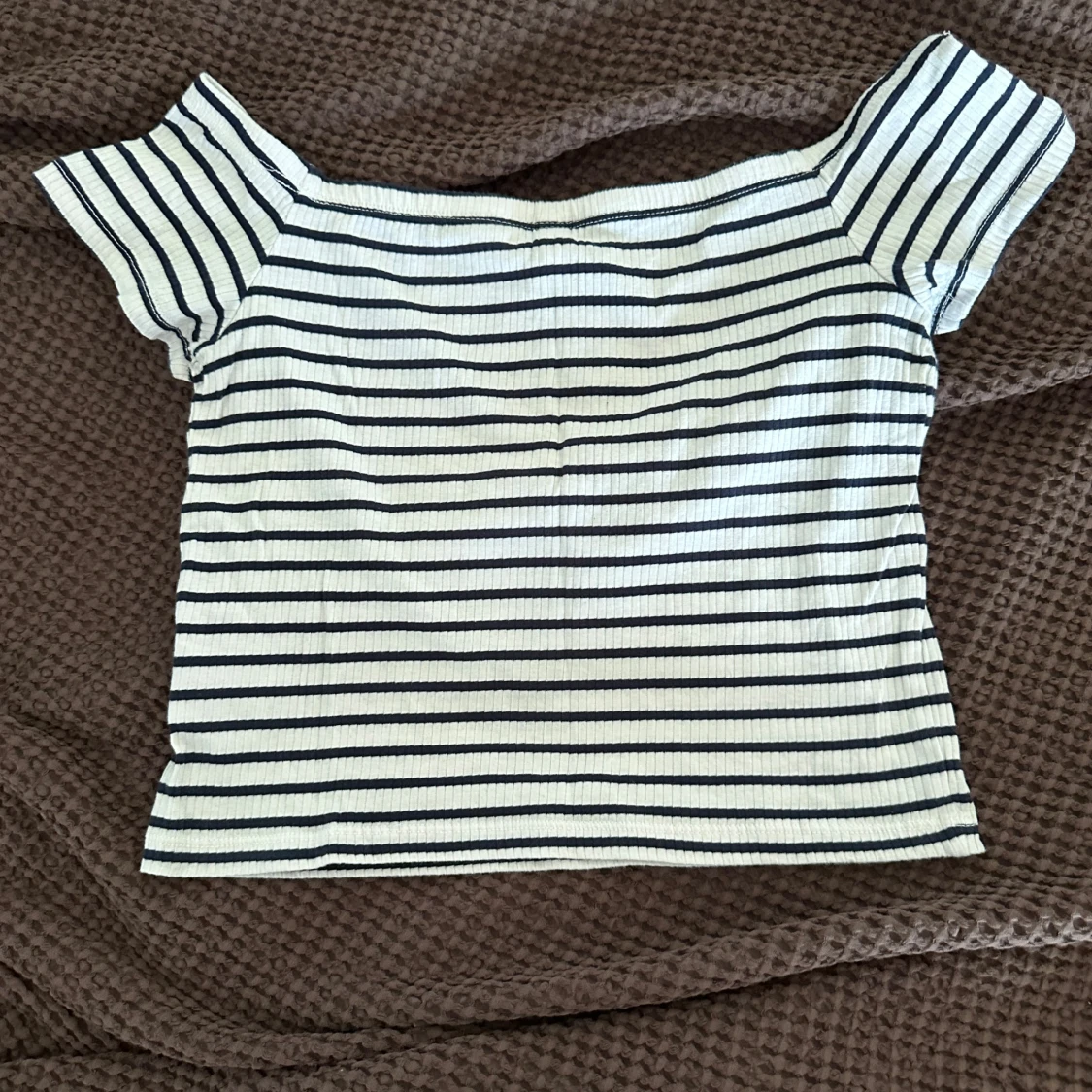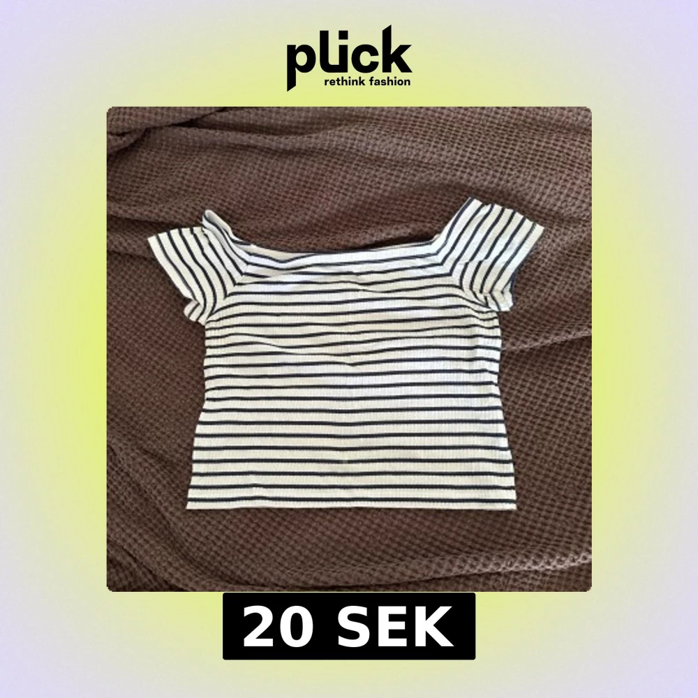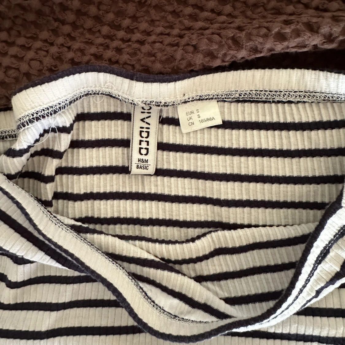 Superfin offshoulder topp från H&M Divided i vitt med svarta ränder. Kortärmad och figurnära passform, perfekt till jeans eller kjol. Mjuk och stretchig bomullskvalitet som känns skön mot huden.
