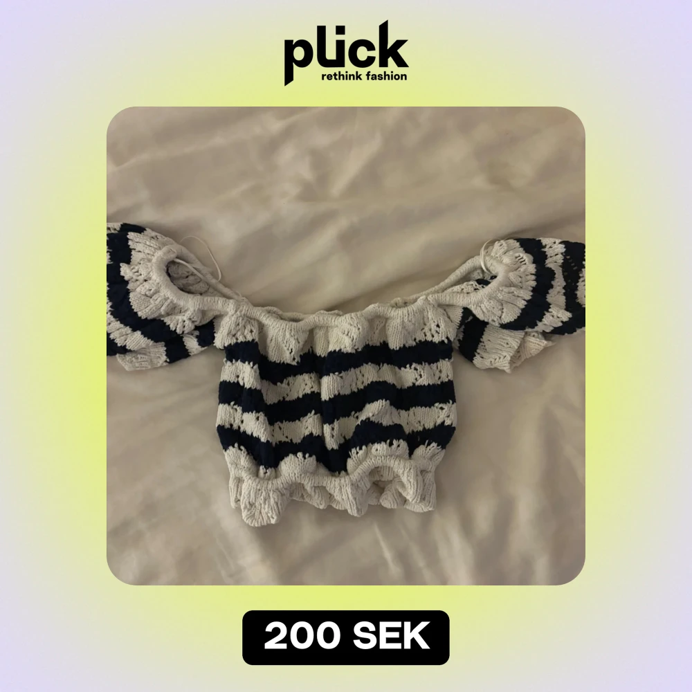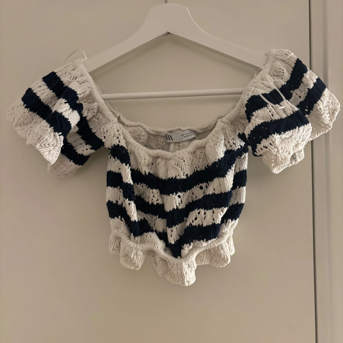 Säljer en superfin randig offshoulder topp i blått och vitt. Den är croppad och har volangdetaljer vid ärmslut och nederkant. Perfekt för sommardagar eller en festlig kväll. Toppen är i mycket bra skick