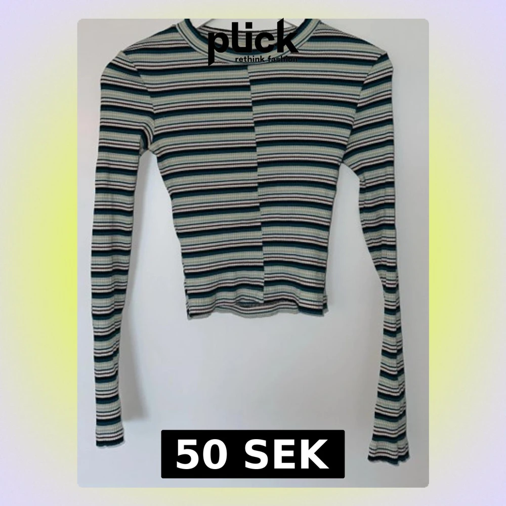 Trendig långärmad topp med smal ribbad struktur och horisontella ränder i grönt, svart, vitt och beige. Croppad modell med rund halsringning