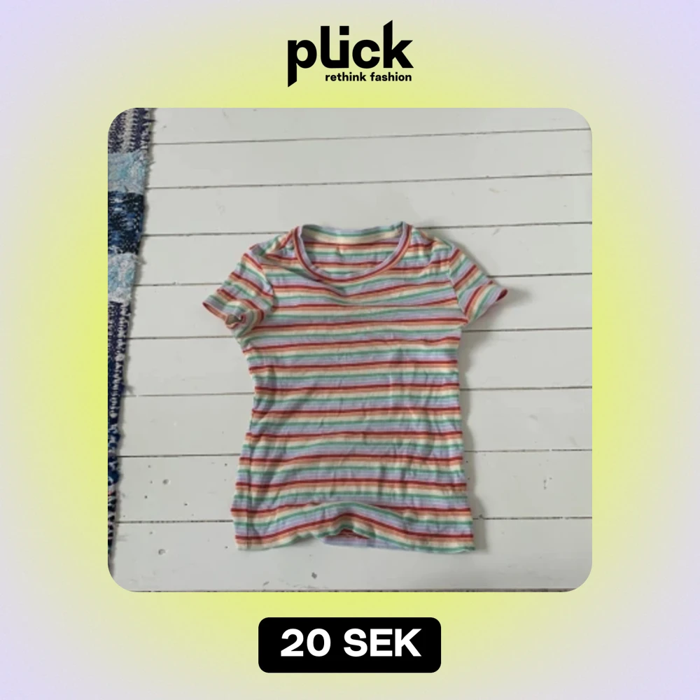 Säljer en superfin randig t-shirt med korta ärmar. Den har ett färgglatt mönster i rött, grönt, orange och lila. Materialet är ribbat vilket ger en skön och stretchig passform. Perfekt för en avslappnad sommarlook!