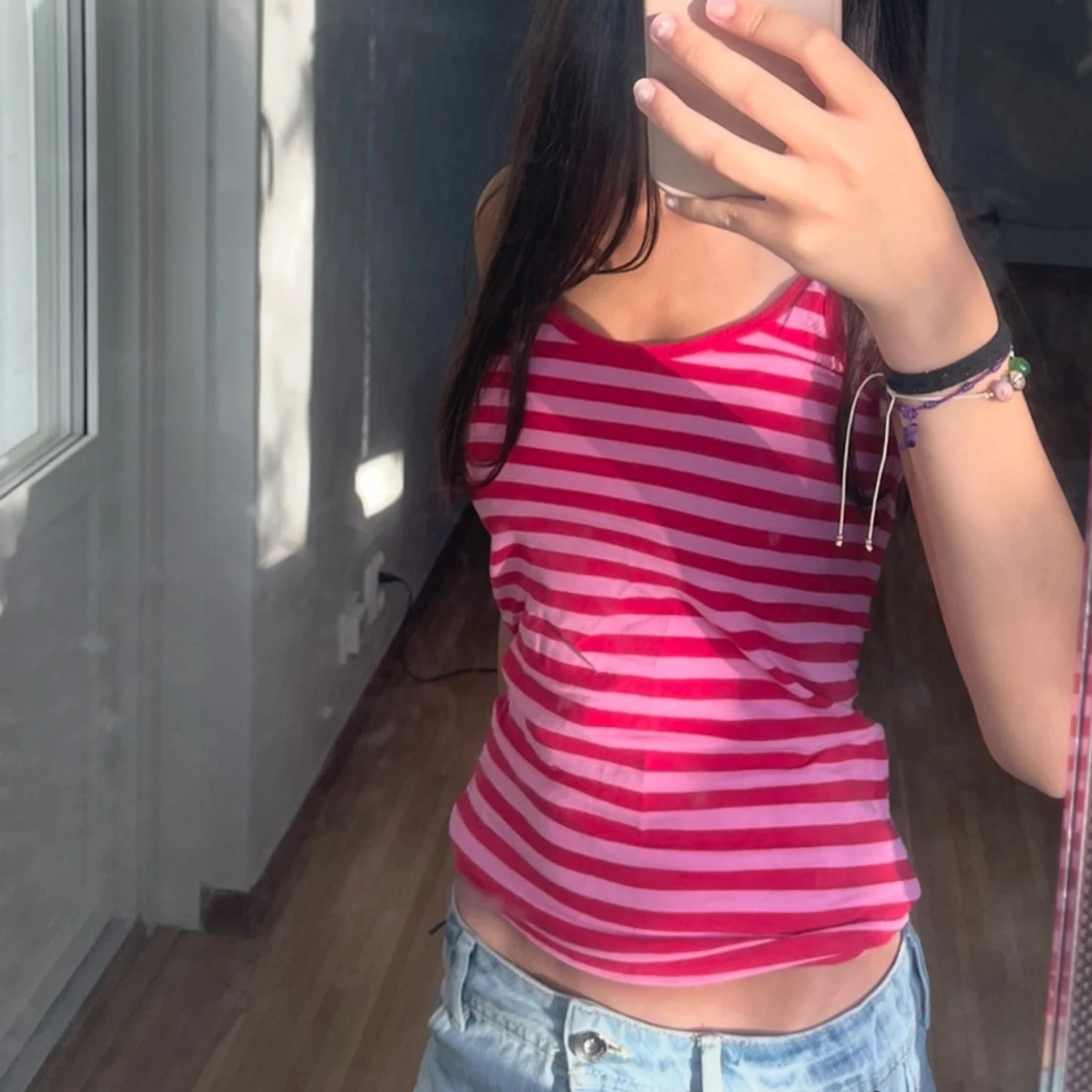 Säljer ett randigt linne i rosa och vit. Passar storlek XXS-S