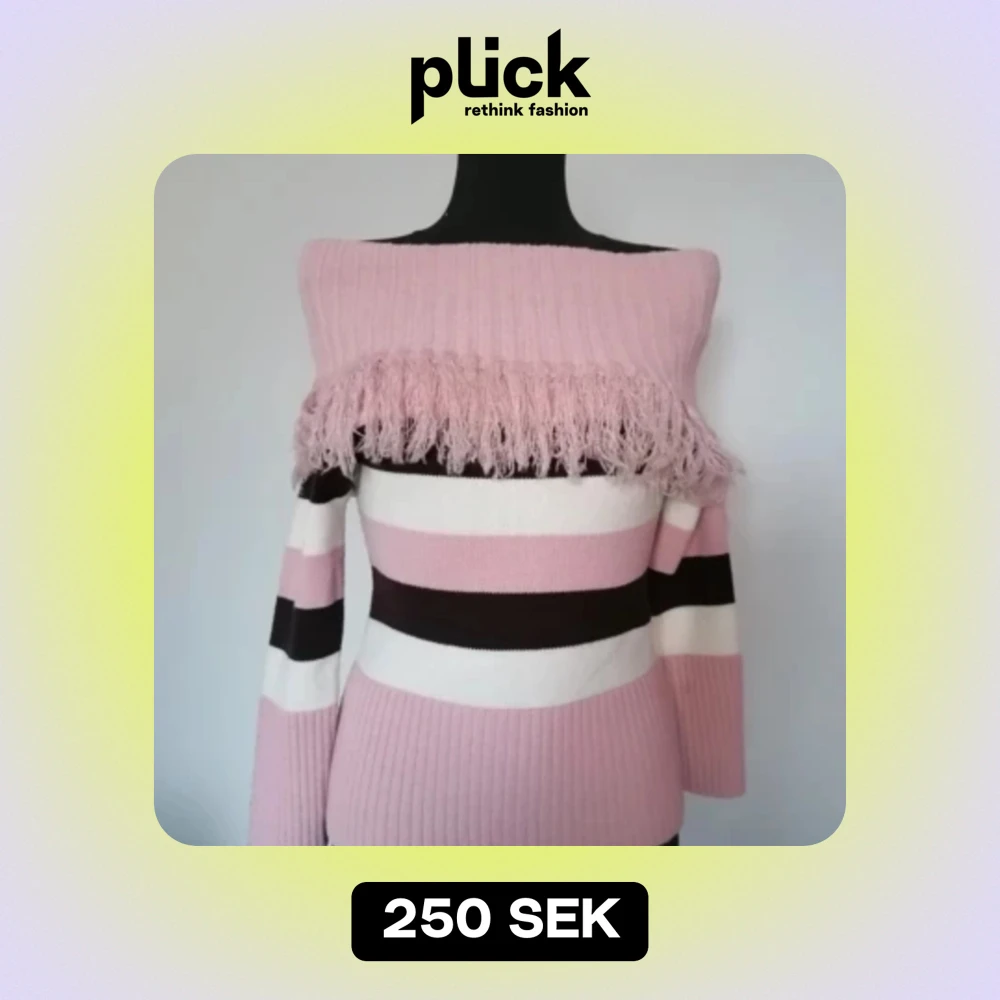 Off shoulder tröja med rosa, vita och svarta ränder. Skulle säga storlek S! Y2k vibe💕