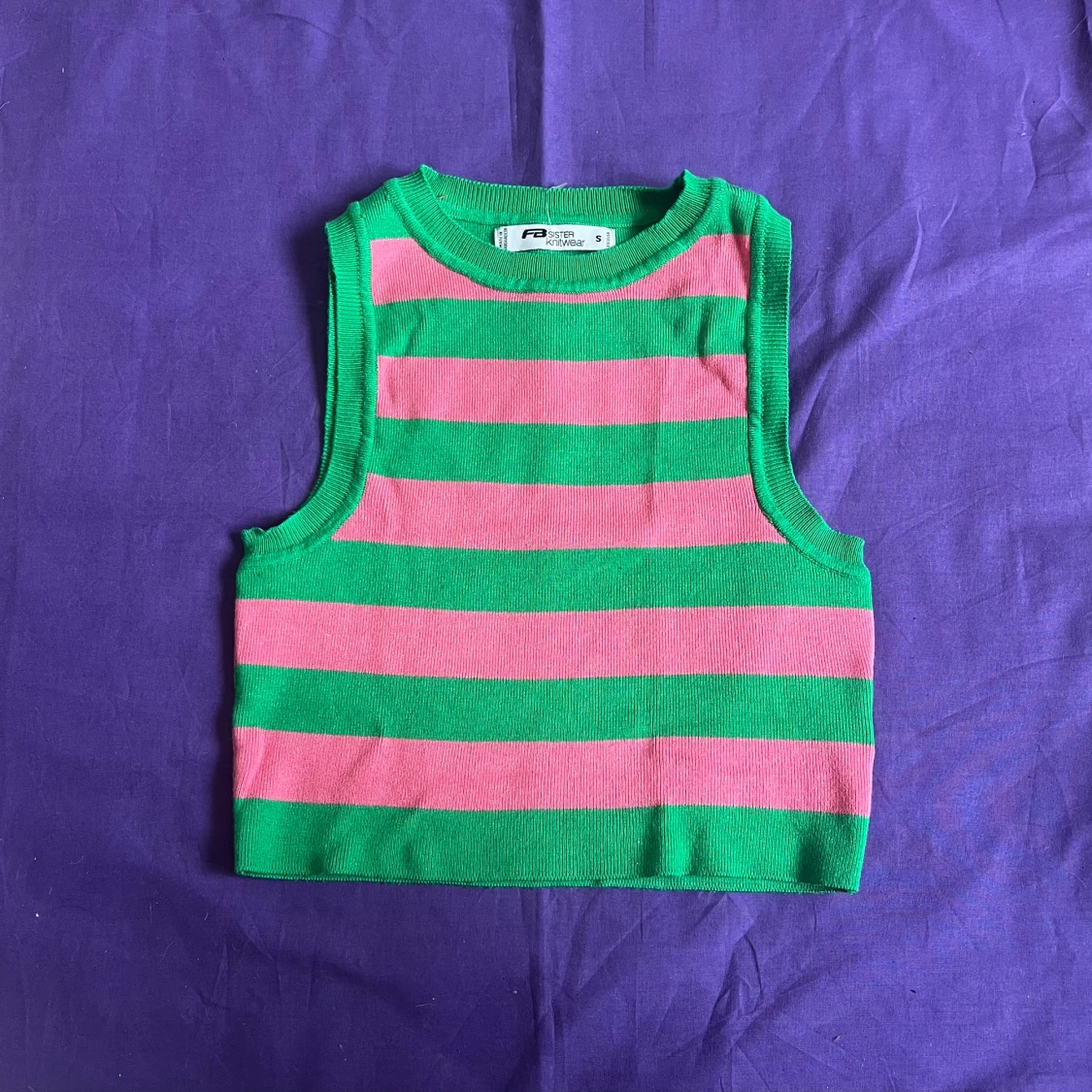 Starka färger i rosa och grön. Stickat tyg, mycket stretchig. 80% viskos, 20%polyamid Knappt använd.