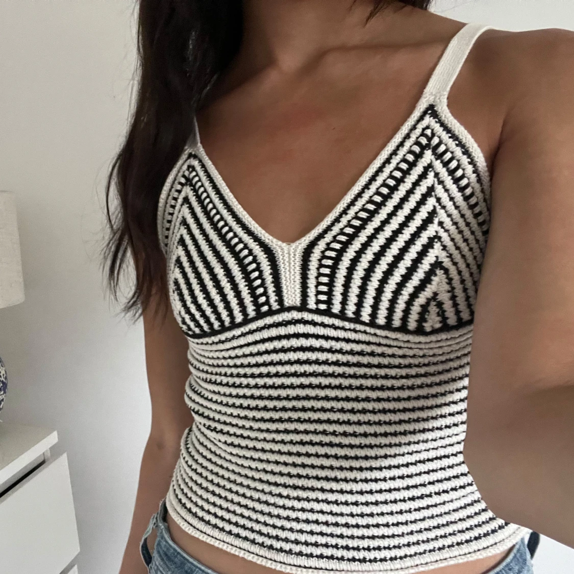 Supersnygg stickad topp med svarta och vita ränder. Toppen har smala axelband, v-ringning och croppad passform. Perfekt till jeans eller kjol för en trendig look.