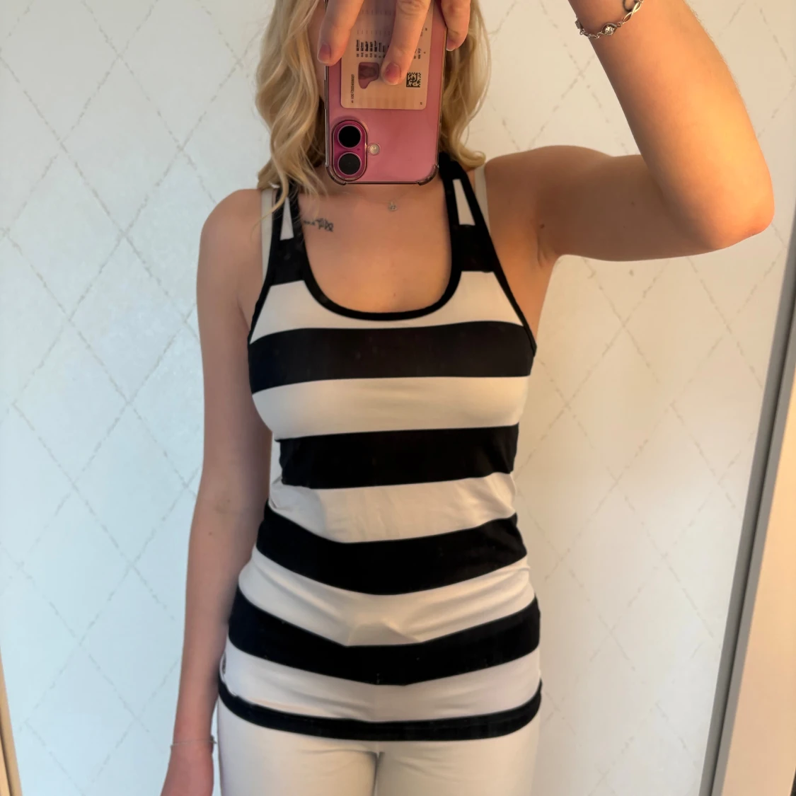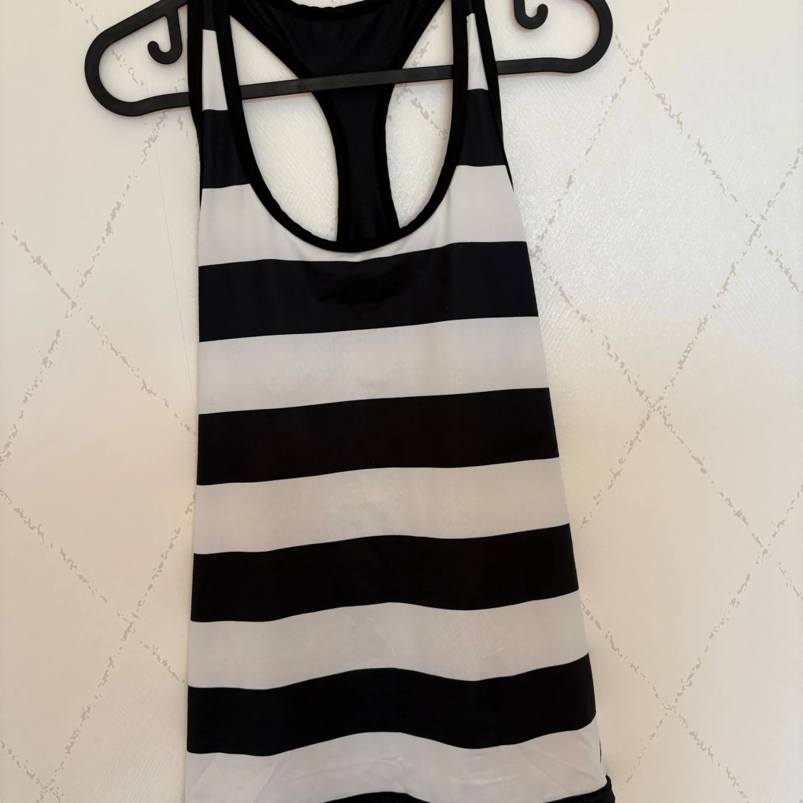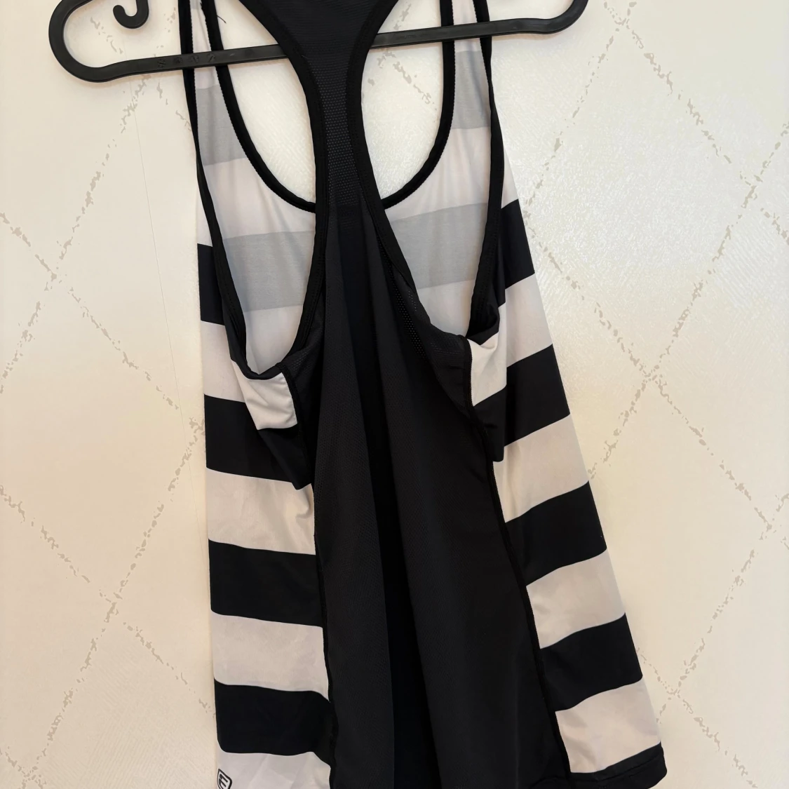 Säljer ett snyggt träningslinne med breda svarta och vita ränder. Modellen har brottarrygg och ärmlös design, perfekt för varma dagar eller träning. Materialet känns lätt och stretchigt, vilket gör den superbekväm att bära.