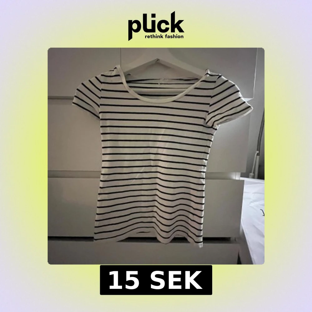 Säljer en klassisk vit och svart randig t-shirt i mjuk bomull. Den har korta ärmar och en rund halsringning. Perfekt för en avslappnad stil.
