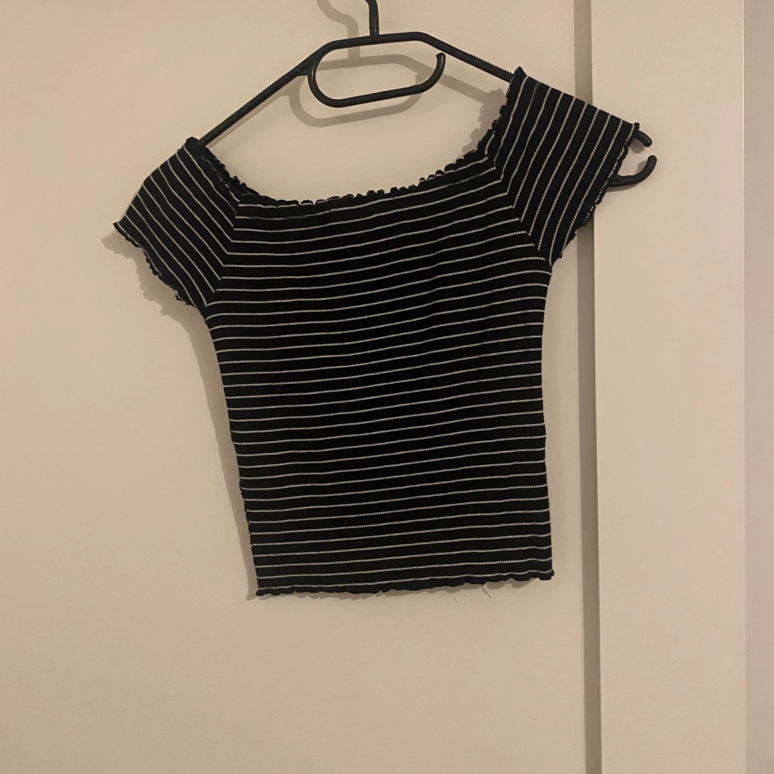 Svart-vit randig ribbat off-shoulder topp. Super stretch mig så passar även S. Kort i modellen. Använd en del men syns inte