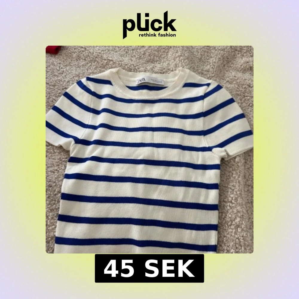 Säljer en kortärmad topp från Zara med klassiska blå och vita ränder. Toppen har rund halsringning och är i mjukt, stickat material. Använd ett fåtal gånger, tar frakt