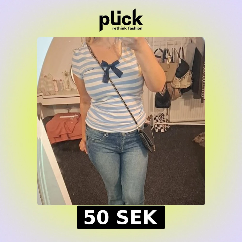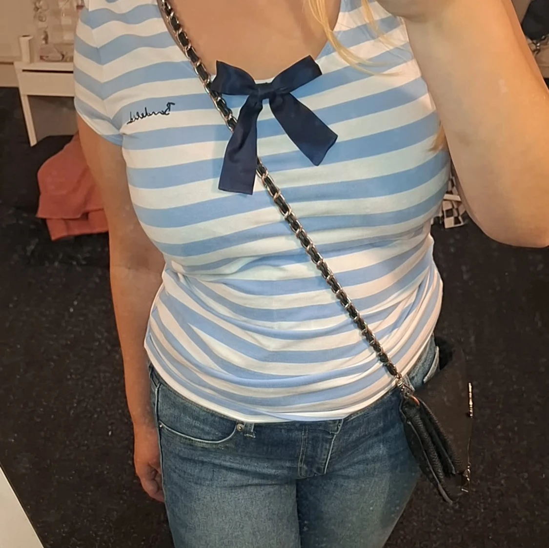 Supersöt topp med ljusblå och vita ränder från bondelid. Stretchig i storlek L men passar ändå på mig som har M💓