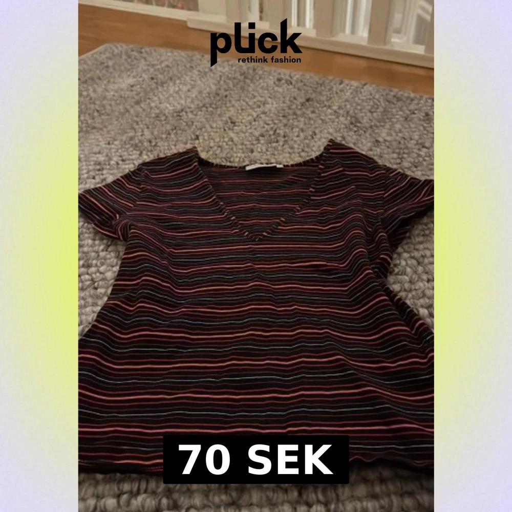 Kortärmad topp från Monki med V-ringning och smal passform. Svart bas med tunna ränder i rött, orange, rosa och blått. Tillverkad i mjukt och stretchigt material som sitter skönt på kroppen. Perfekt för en avslappnad och trendig look.