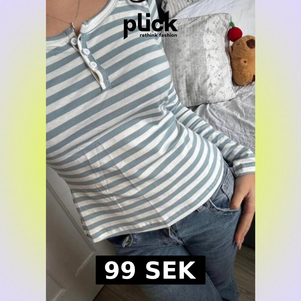 Säljer en långärmad topp med ränder i ljusblått och vitt. Toppen har rund halsringning och en knappslå med fyra vita knappar framtill. Materialet är mjukt och stretchigt bomull. Fick den från en kompis så vet inte vart den är ifrån ser inte lappen men orginal priset va ca 130 sa hon🫶🏼