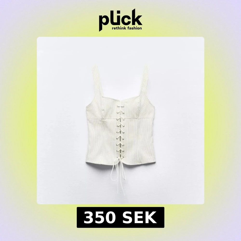 Supersnygg vit korsettopp från Zara med tunna svarta ränder och snörning framtill. Endast använd när jag testade i butik, säljer pga att den tyvärr ej kommit till användning. Går ej att få tag på på hemsidan längre! Toppen har breda axelband, dragkedja i ryggen och är croppad. Materialet är mjukt och känns lyxigt, perfekt för att lyfta din outfit💞