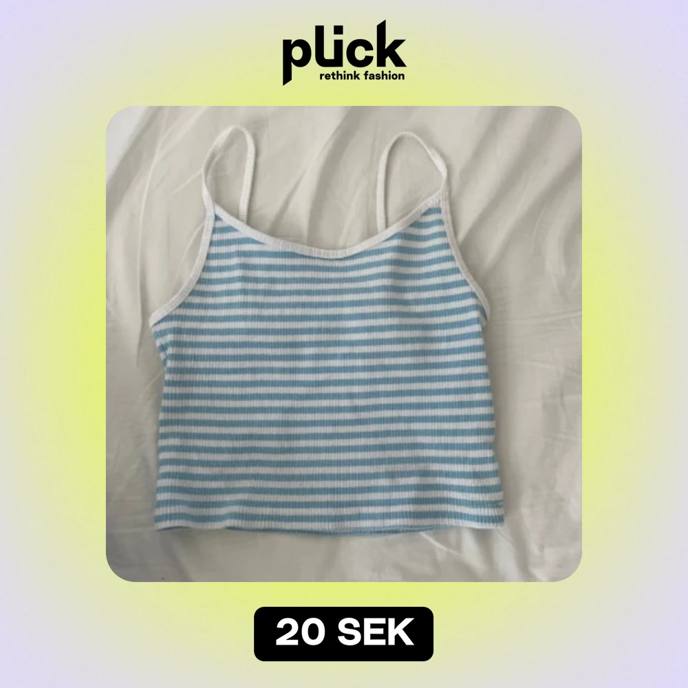 Blå, vitt randigt linne. Är i bra skick och jag inga tydliga skador alls!