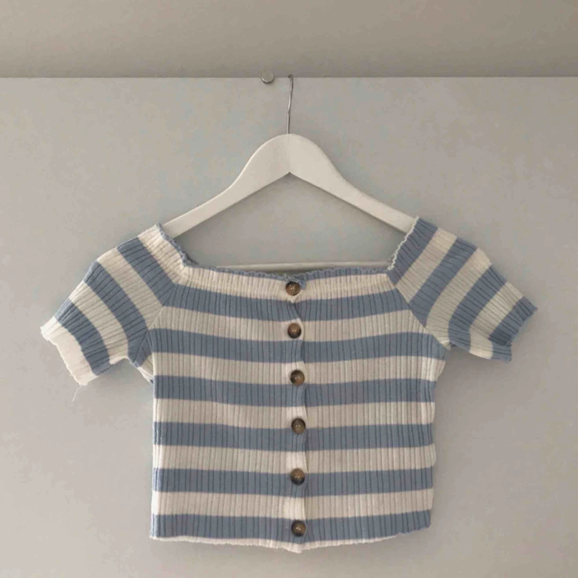 Ljusblå randig topp jag köpte i Rom förra sommaren! Detaljer av trä och den finaste nyansen av blå. Kan användas både som offshoulder / vanlig topp