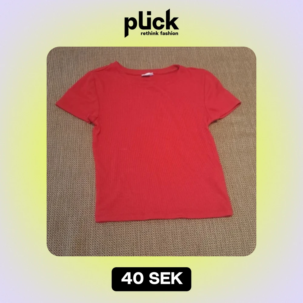 Säljer en snygg röd ribbad t-shirt i ett mjukt och stretchigt material. Perfekt för vardagsbruk eller att styla upp för en festlig look. Den har korta ärmar och en klassisk rund halsringning.