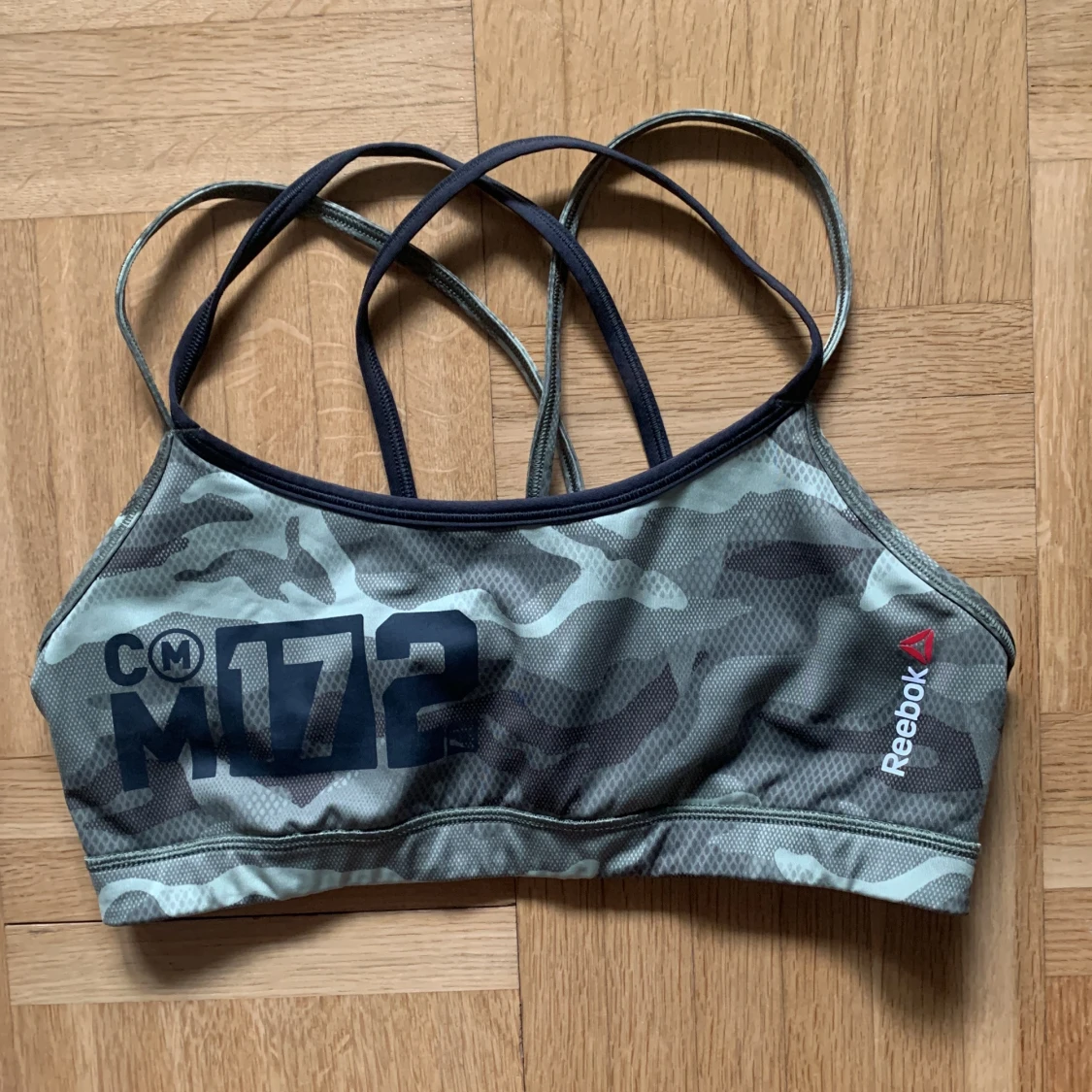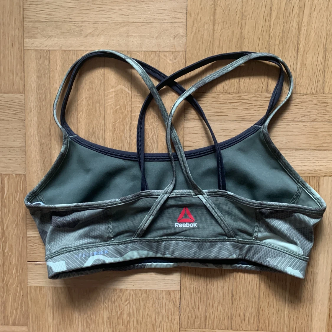 En militärgrön sportbh från Reebok i storlek M, inga pads, välanvänd men den är i fint skick.