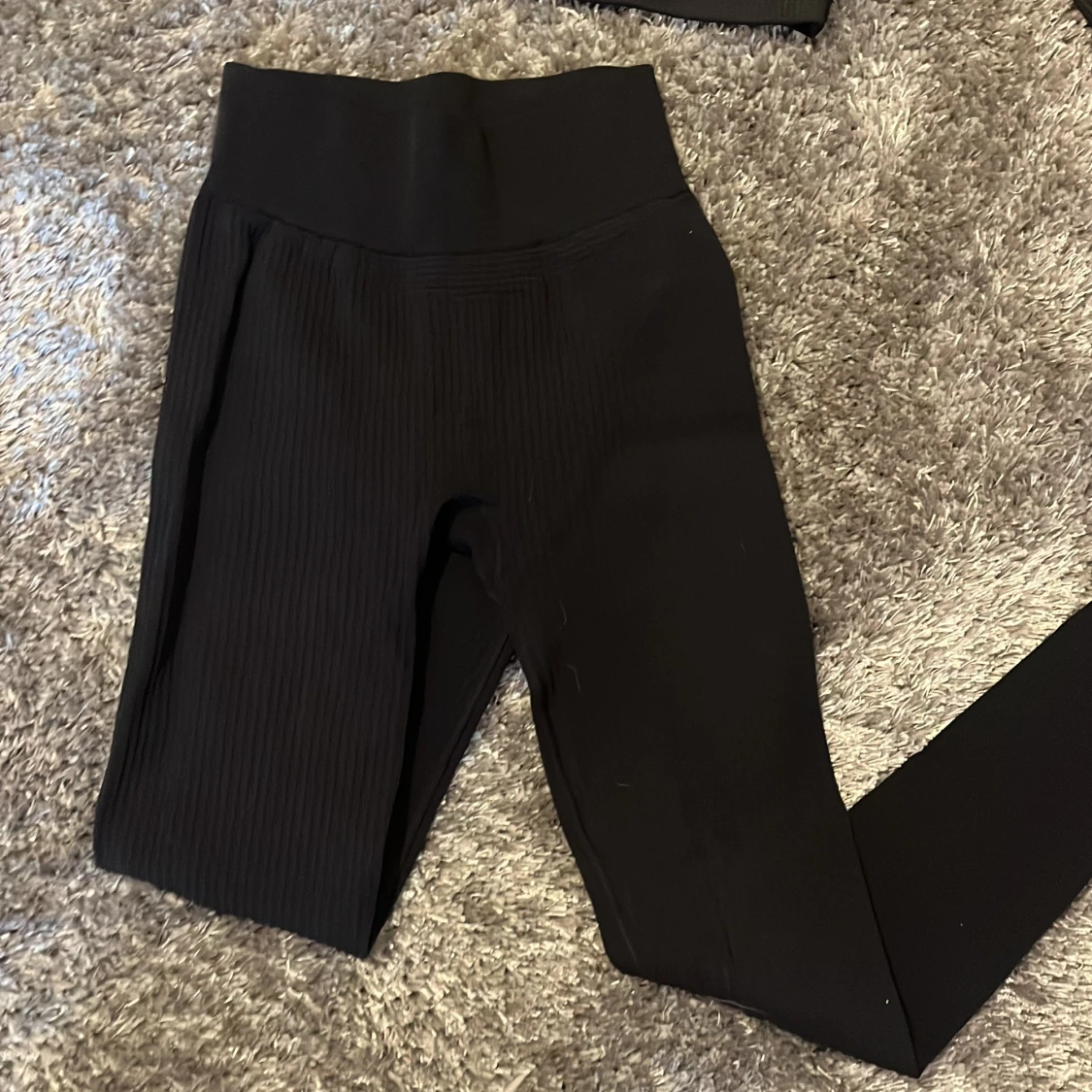 Super fina träningskläder om man ska gå till gymmet eller träna och en topp som är lite kort med ett par tajta träningsbyxor som är en sett. byxorna är ungefär xs till S tröjan kan passa någon med S. Tillsammans kostade dom 420 kr