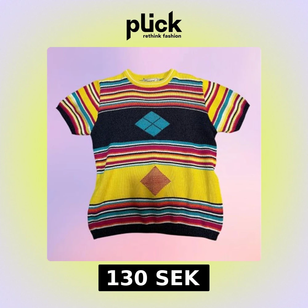 Ett coolt äkta retro plagg! 🌸 Vintage stickad kortärmad topp med färgglatt mönster. Häftig baksida på tröjan dessutom. Spekulerar att den är kanske från 70-talet? Men jag vet inte exakt. Jättefin utan defekter, inga noppror heller! Storlek S från märket Ganard. Normal i storleken. Vid frågor eller så är det bara att skriva!