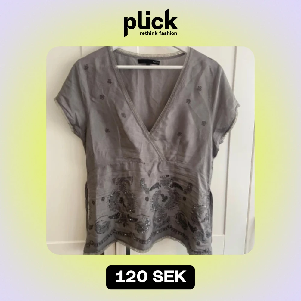 Säljer en elegant grå blus från Vila med v-ringning och korta ärmar. Blusen har vackra paljettdetaljer och ett knytband i midjan för en fin passform. Perfekt för både vardag och fest!