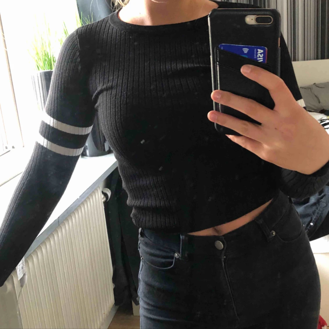 thight ribbad tröja från hm med tvp vita streck på armarna! köparen står för frakt (30kr)