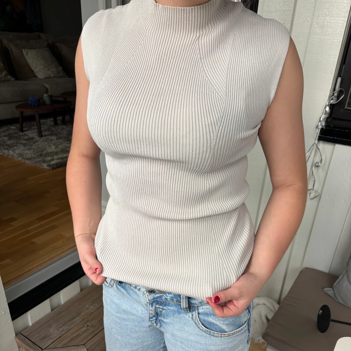 Säljer en stilren, ribbad topp i ljusbeige med hög hals och ärmlös design. Toppen har en tight passform och är tillverkad i ett stretchigt material som sitter snyggt mot kroppen. Perfekt att matcha med jeans eller kjol för en clean look. Perfekt nu till hösten🍁🍂