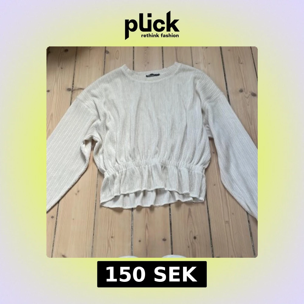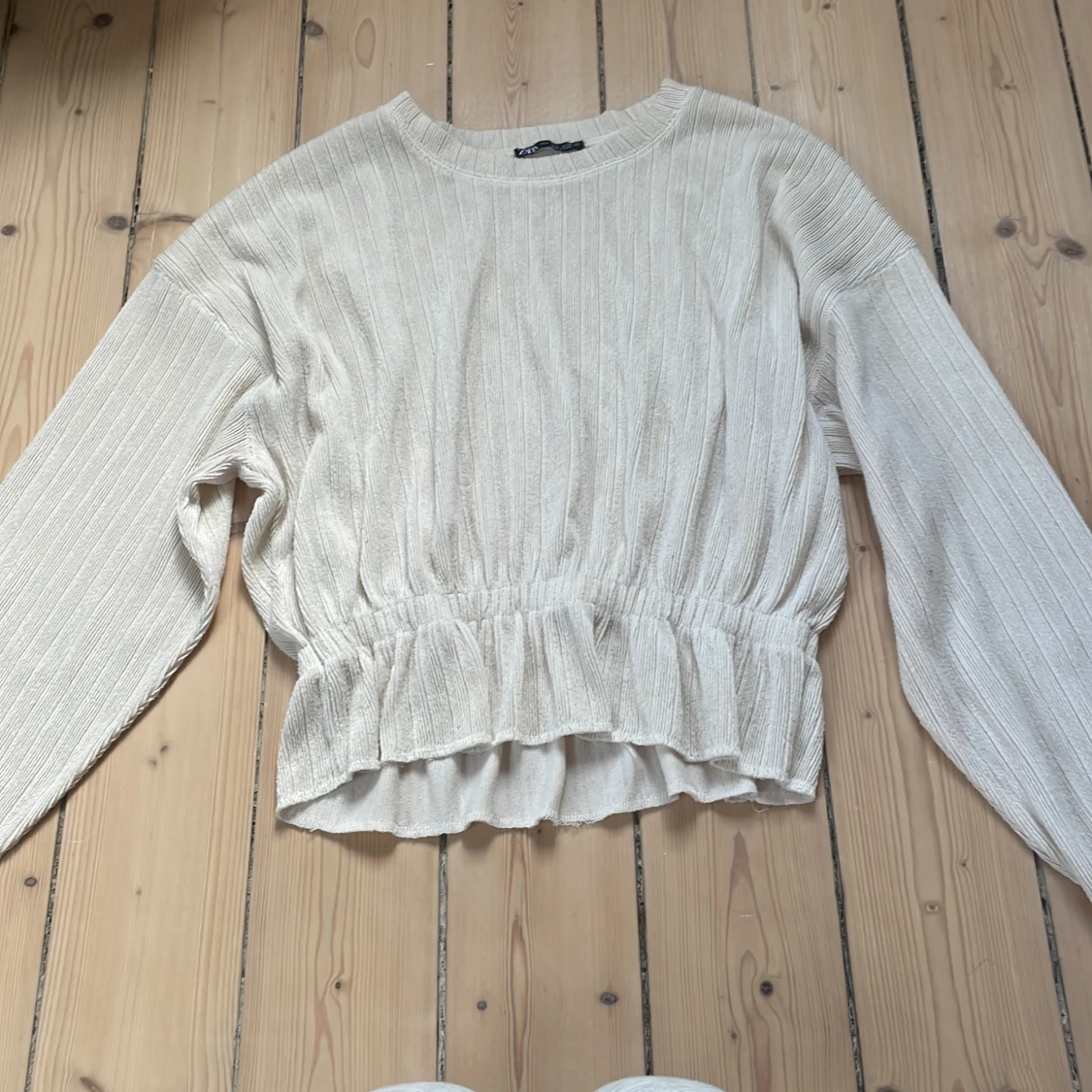Superfin ribbad topp från Zara i beige med lång ärm och volangdetalj nedtill. Modellen är croppad med resår i midjan för en snygg passform. Perfekt till jeans eller kjol för en trendig look.