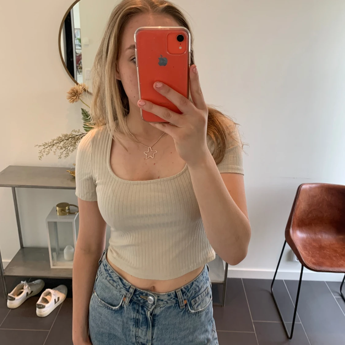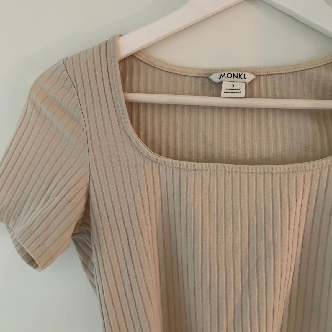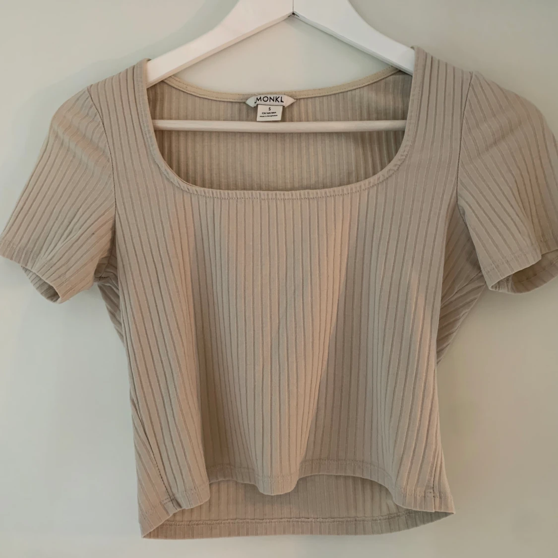 Ribbad, kortärmad croptop från Monki! Den passar till allt och är toppen att ha under tröjor eller till jeans! Väldigt bra skick😊 Skriv för fler bilder💗🌟